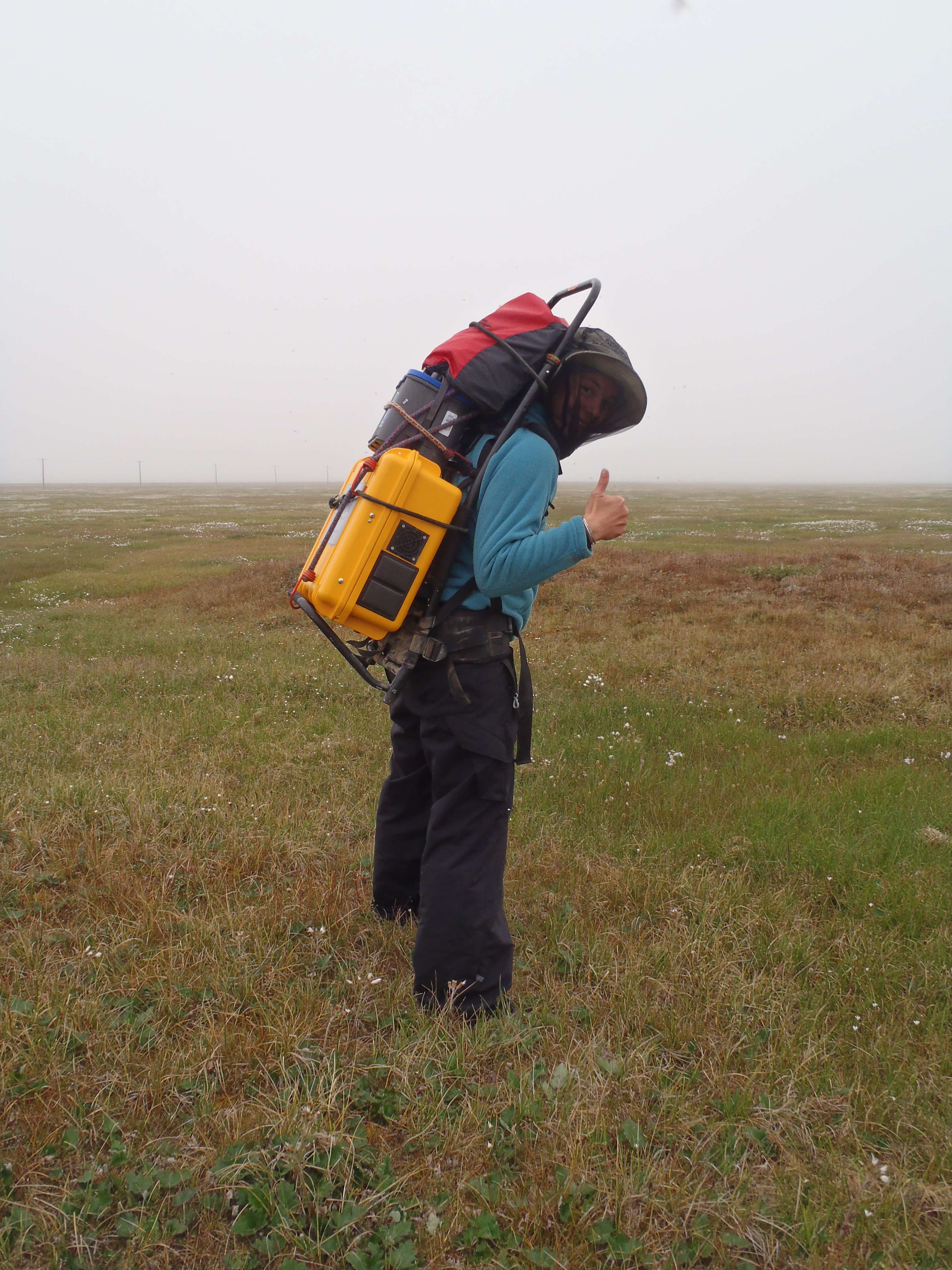 Kim is suited up with a greenhouse gas analyzer machine, AC adapter, and a car battery. Barrow, Alaska.