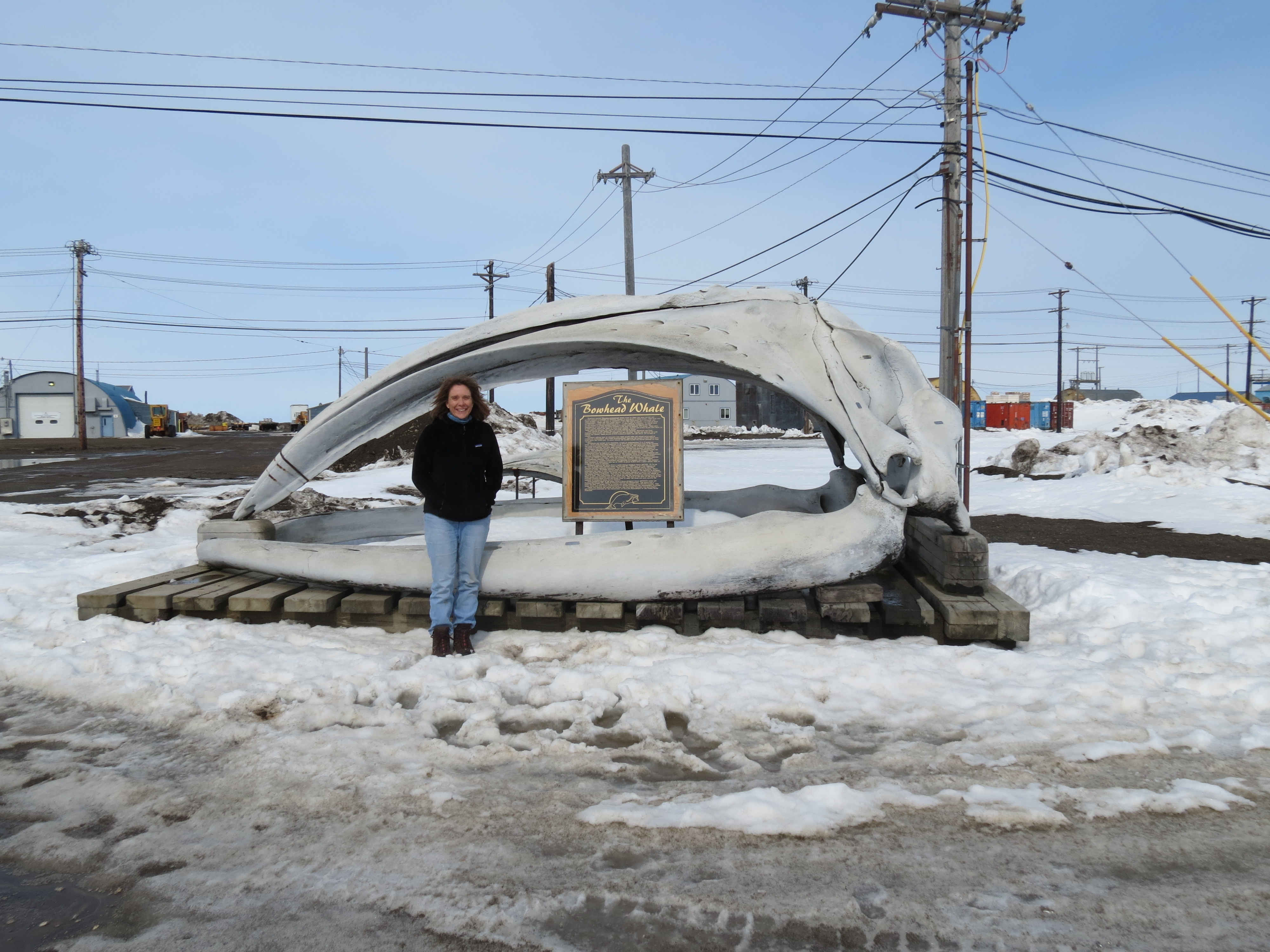 Lisa Seff stands by a bowhead whale skull at the NARL campus. U.S. Navel Arctic Research Laboratory (NARL) in Barrow, Alaska.
