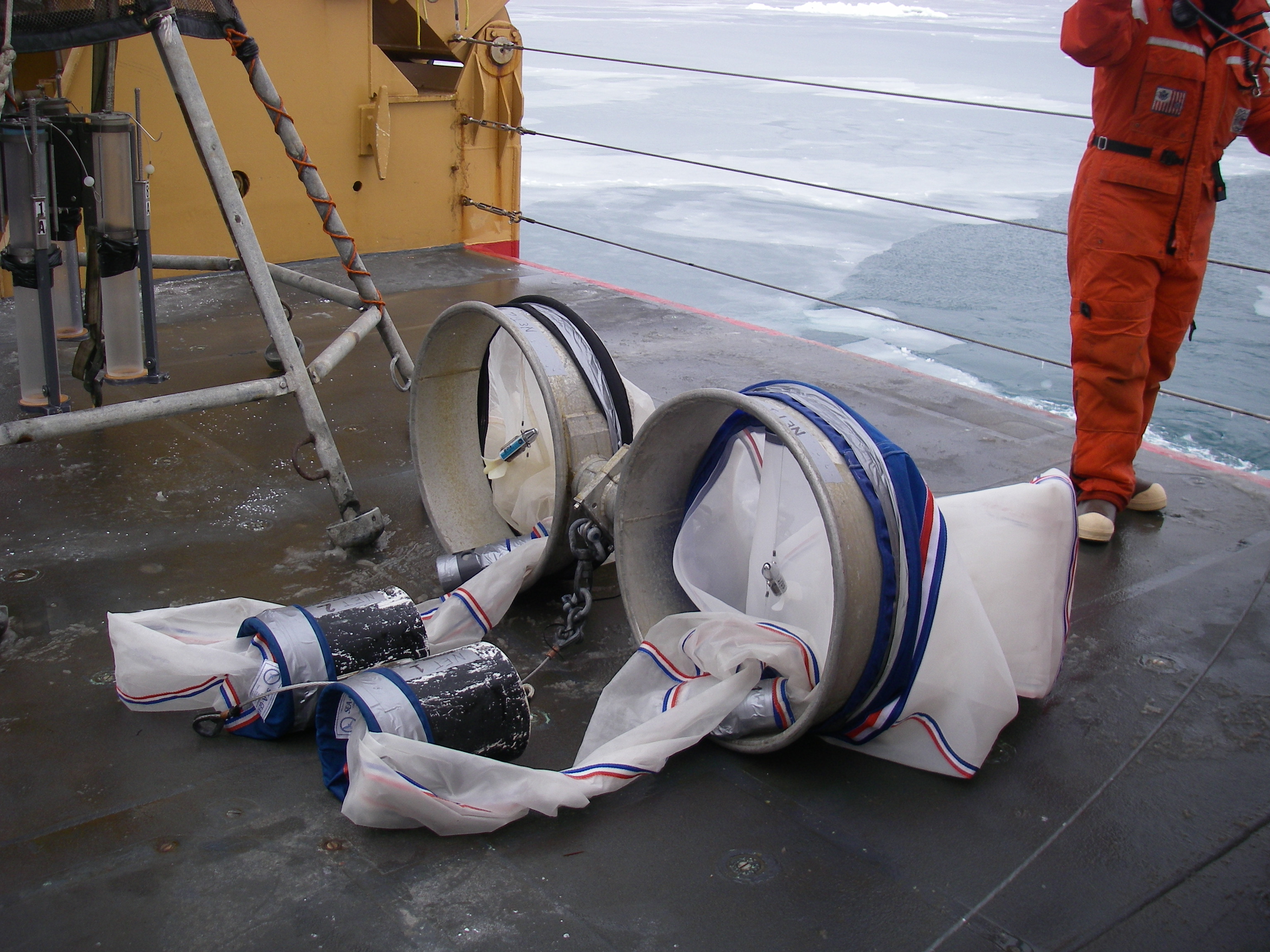 Two different sized bongo nets getting ready to be launched on the aft deck. On the aft deck of the USCGC Healy icebreaker, on the Bering Sea.