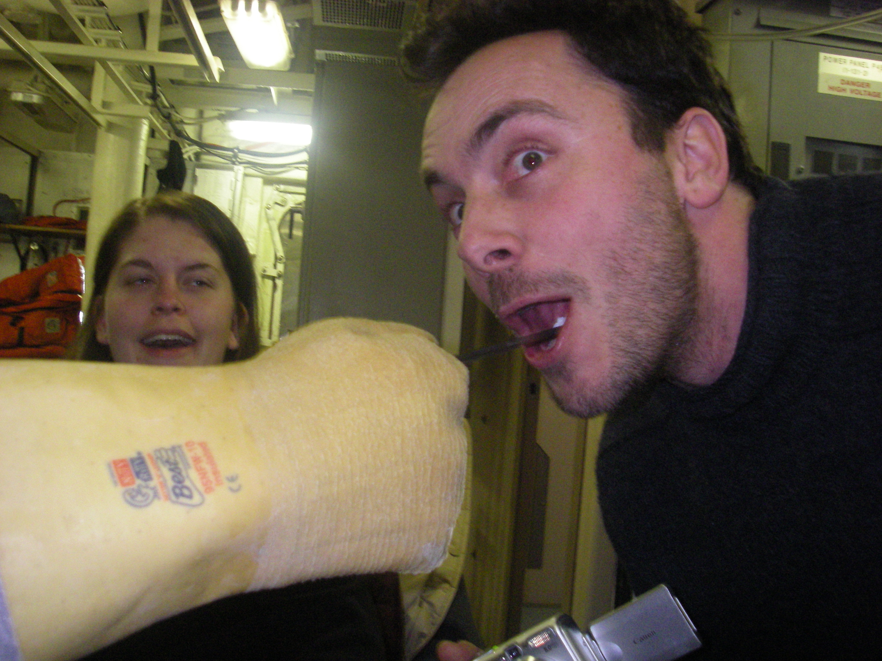 David Hyrenbach stops snapping photos long enough to get a taste of our experiment. Mmmmm tasty! In the science lab on the USCGC Healy icebreaker, on the Bering Sea.