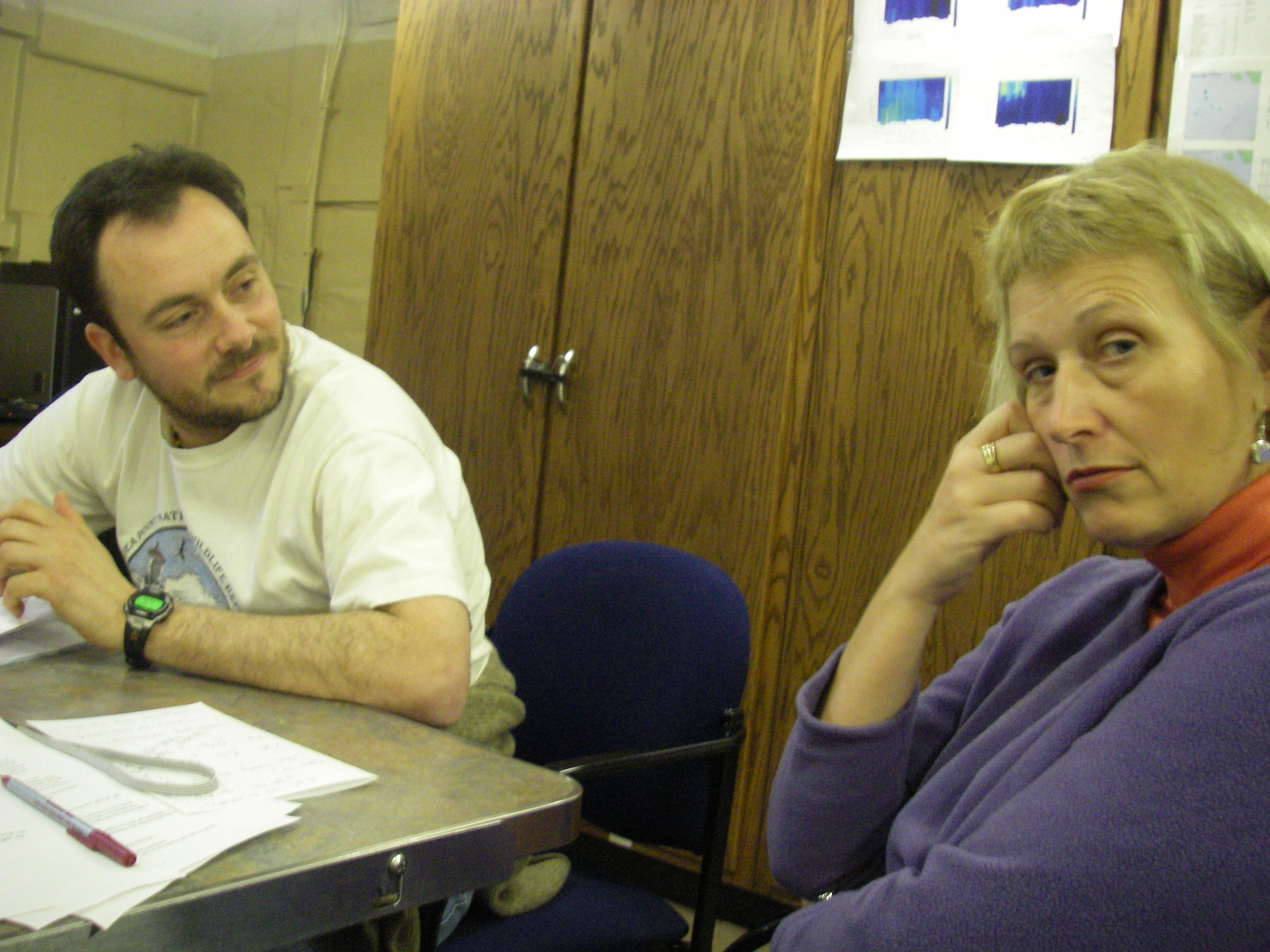 David Hyrenbach looks towards Maggie Prevenas to get her thoughts on the first IPY event. In the conference room on board the USCGC Healy icebreaker, on the Bering Sea.