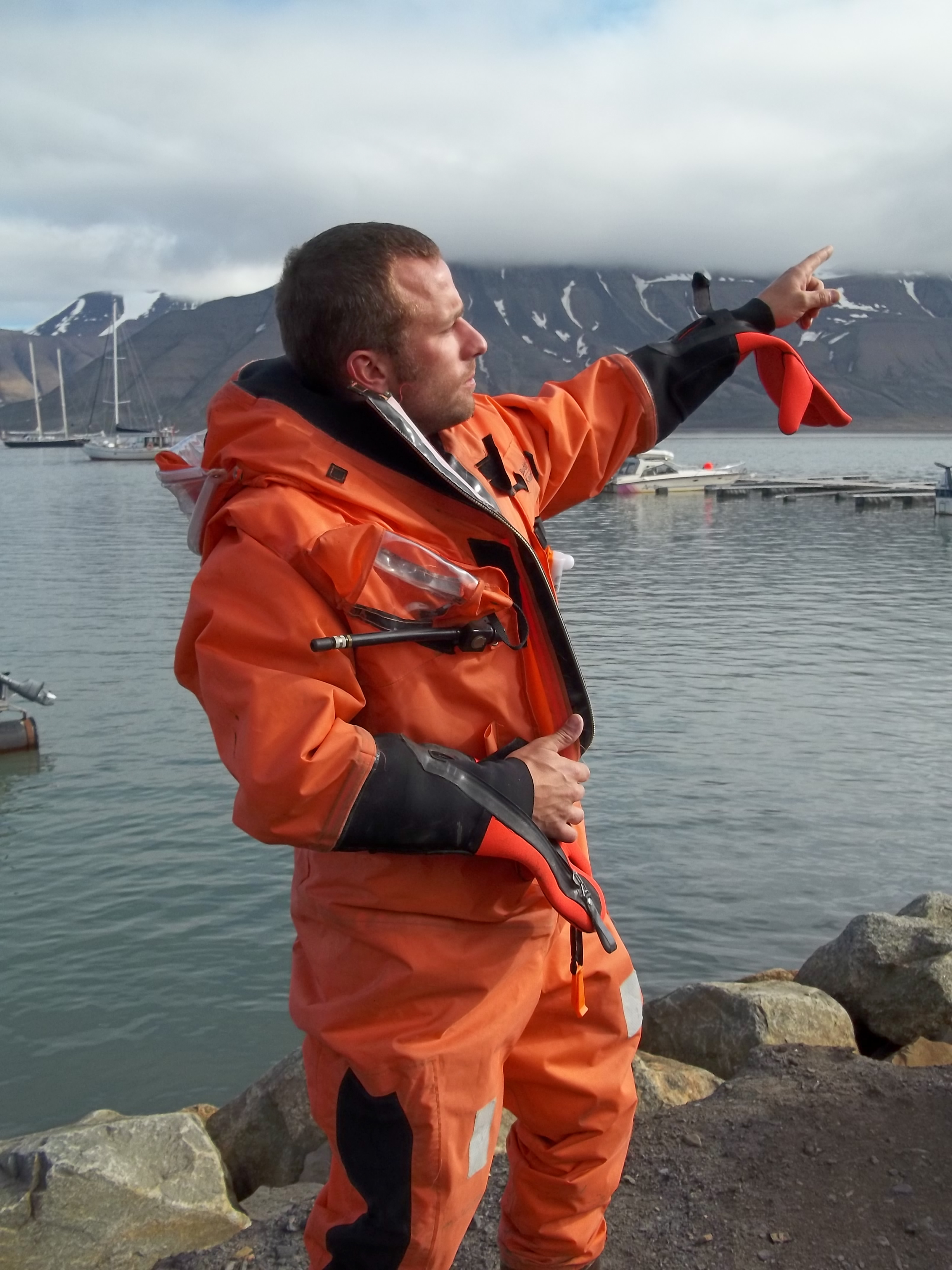Dan wears with his survival suit and makes his best arctic explorer pose, prior to taking off for Kapp Linne. Longyearbyen, Svalbard.