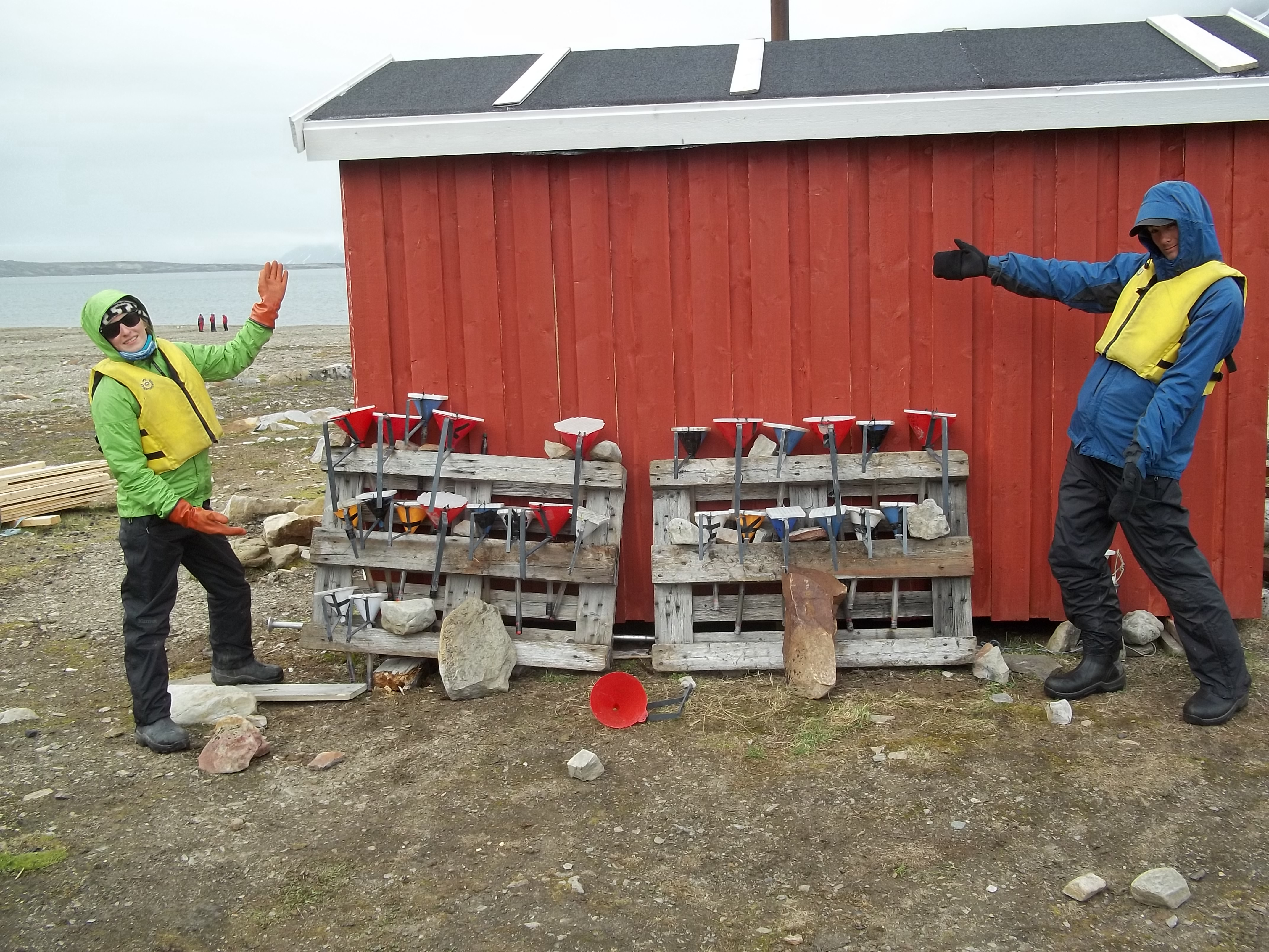 Helena Tiedmann and Dion Obermeyer show off their fresh sediment traps. Isfjord Radio at Kapp Linne, Svalbard.