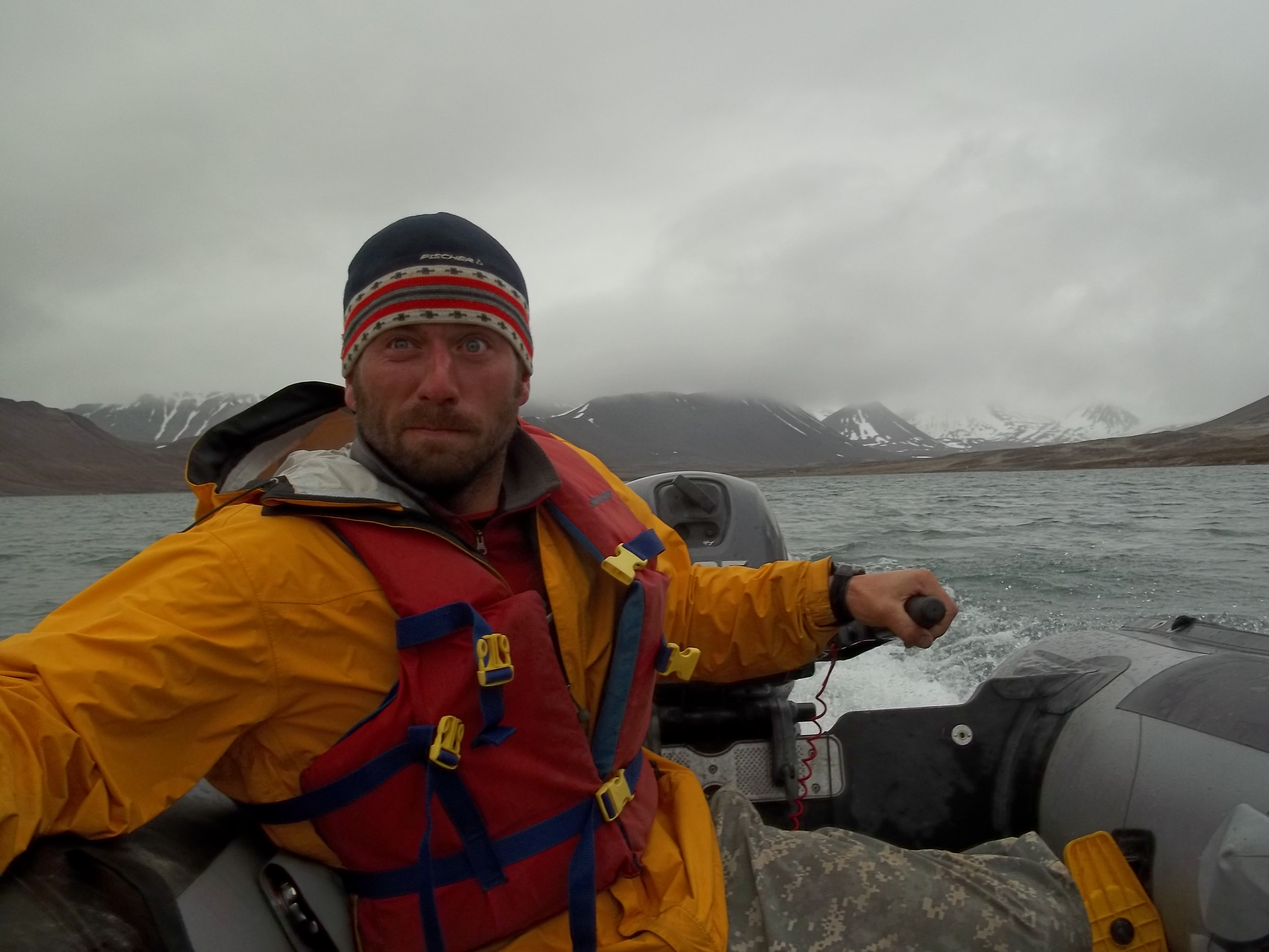 Dan Frost furiously drives the boat back to pick up the karst group. Isfjord Radio at Kapp Linne, Svalbard.