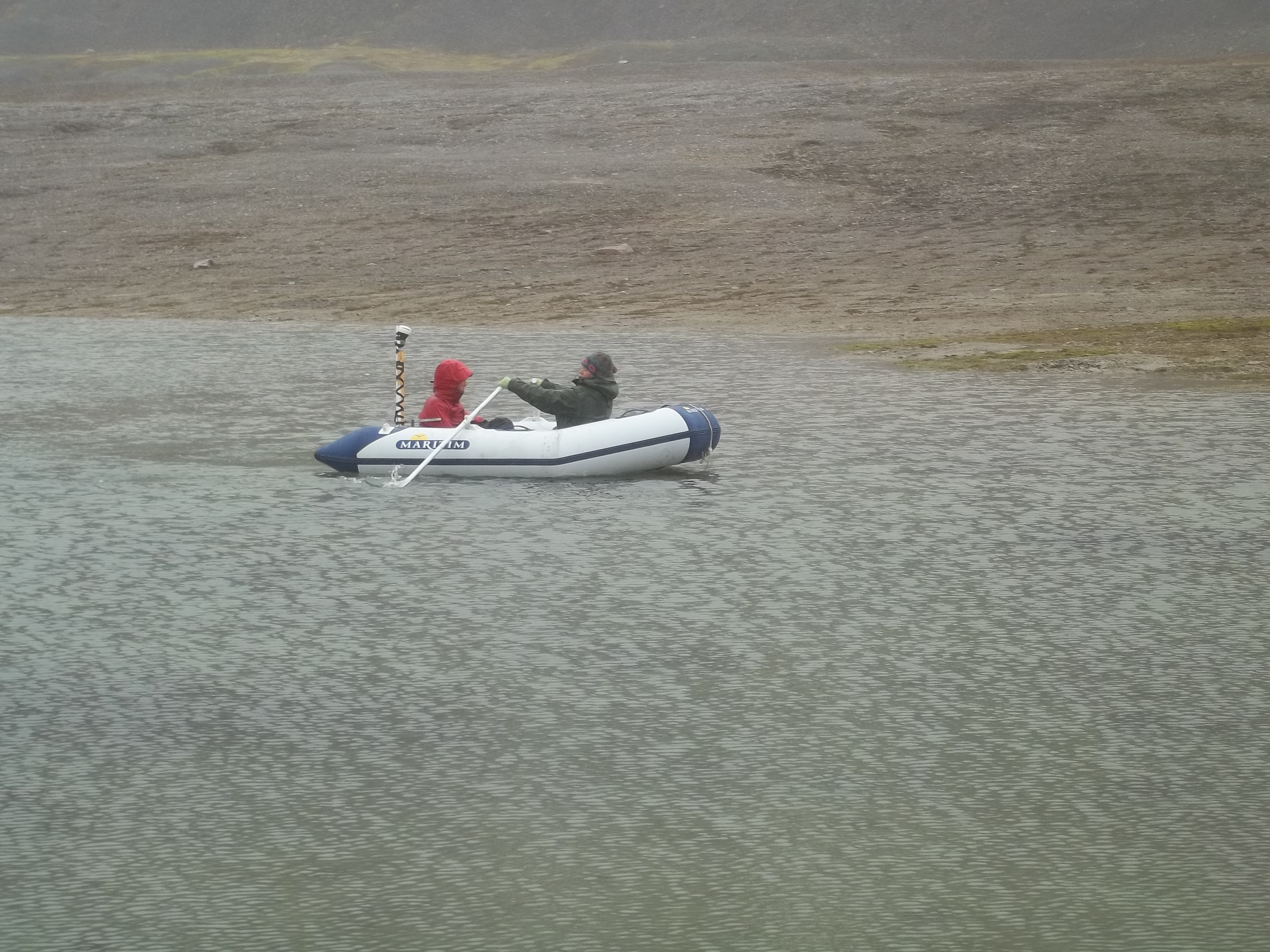 Hanna Axén and Elin Roalkvam row the boat on lake 6. Isfjord Radio at Kapp Linne, Svalbard.