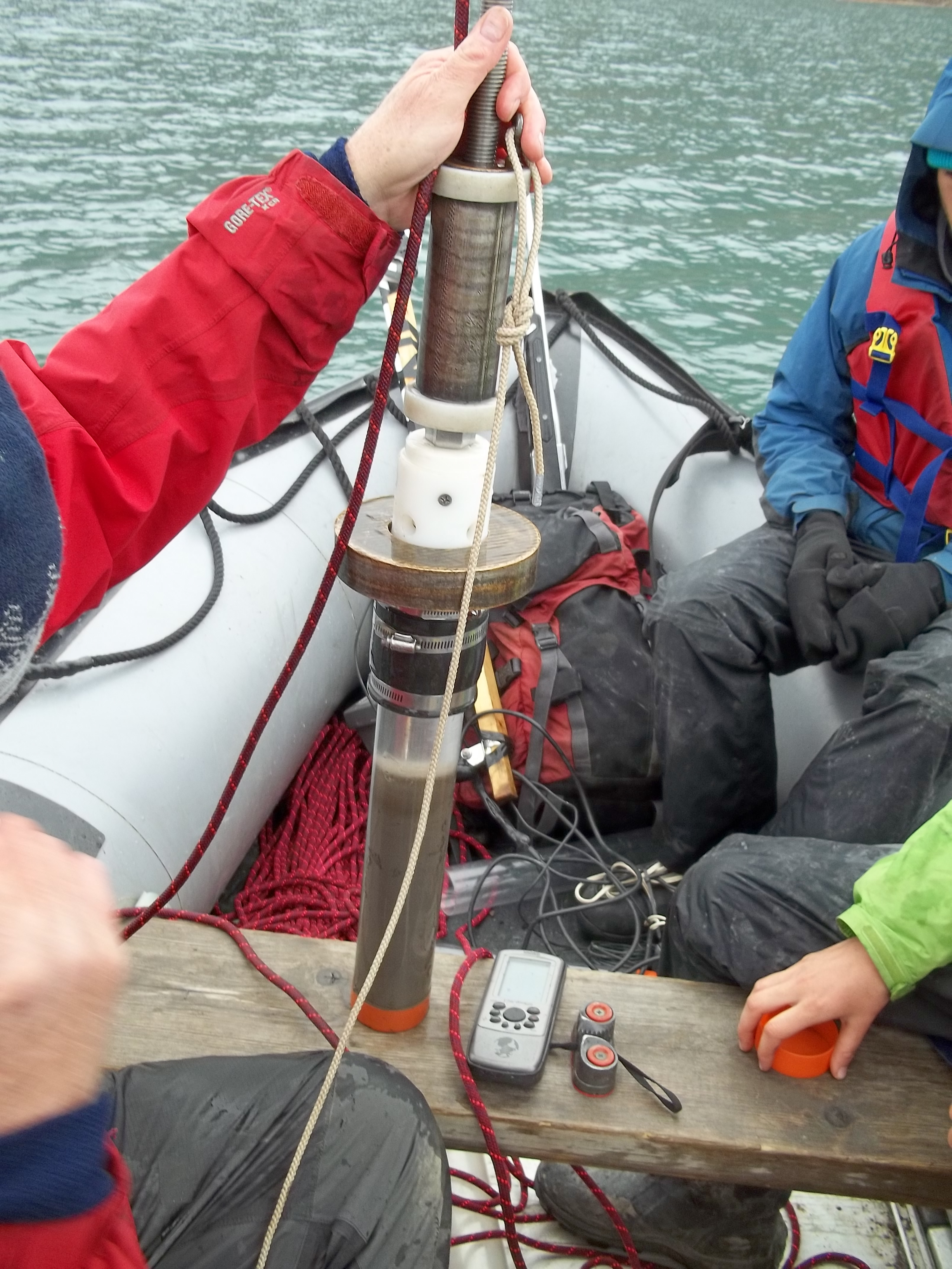 Fresh sediments just cored and still in the corer on Lake Linne. Isfjord Radio at Kapp Linne, Svalbard.