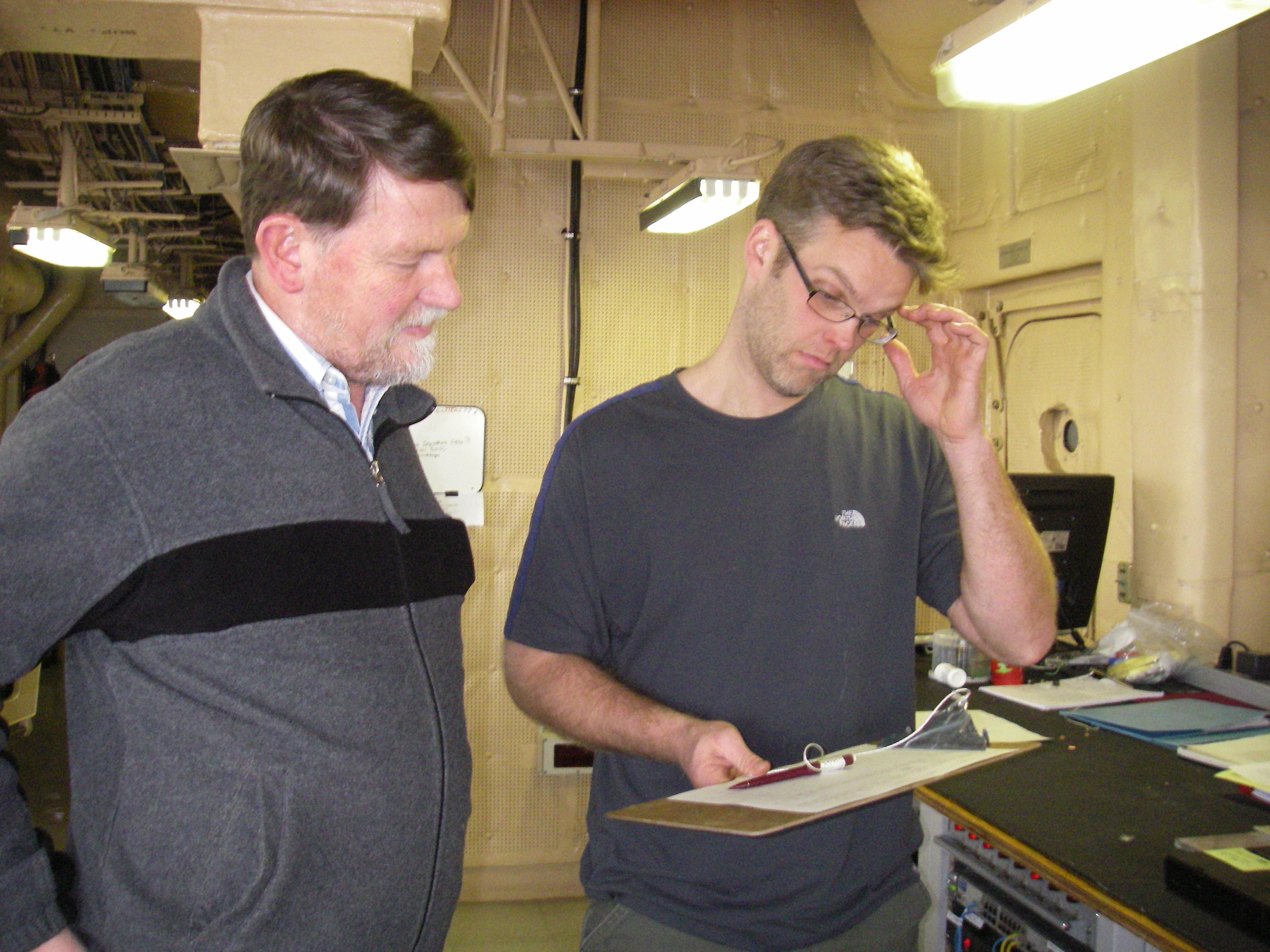 Ned Cokelet and Dylan Righi review the scientist's event log to determine how many water samples are needed. On the USCGC Healy icebreaker, on the Bering Sea.