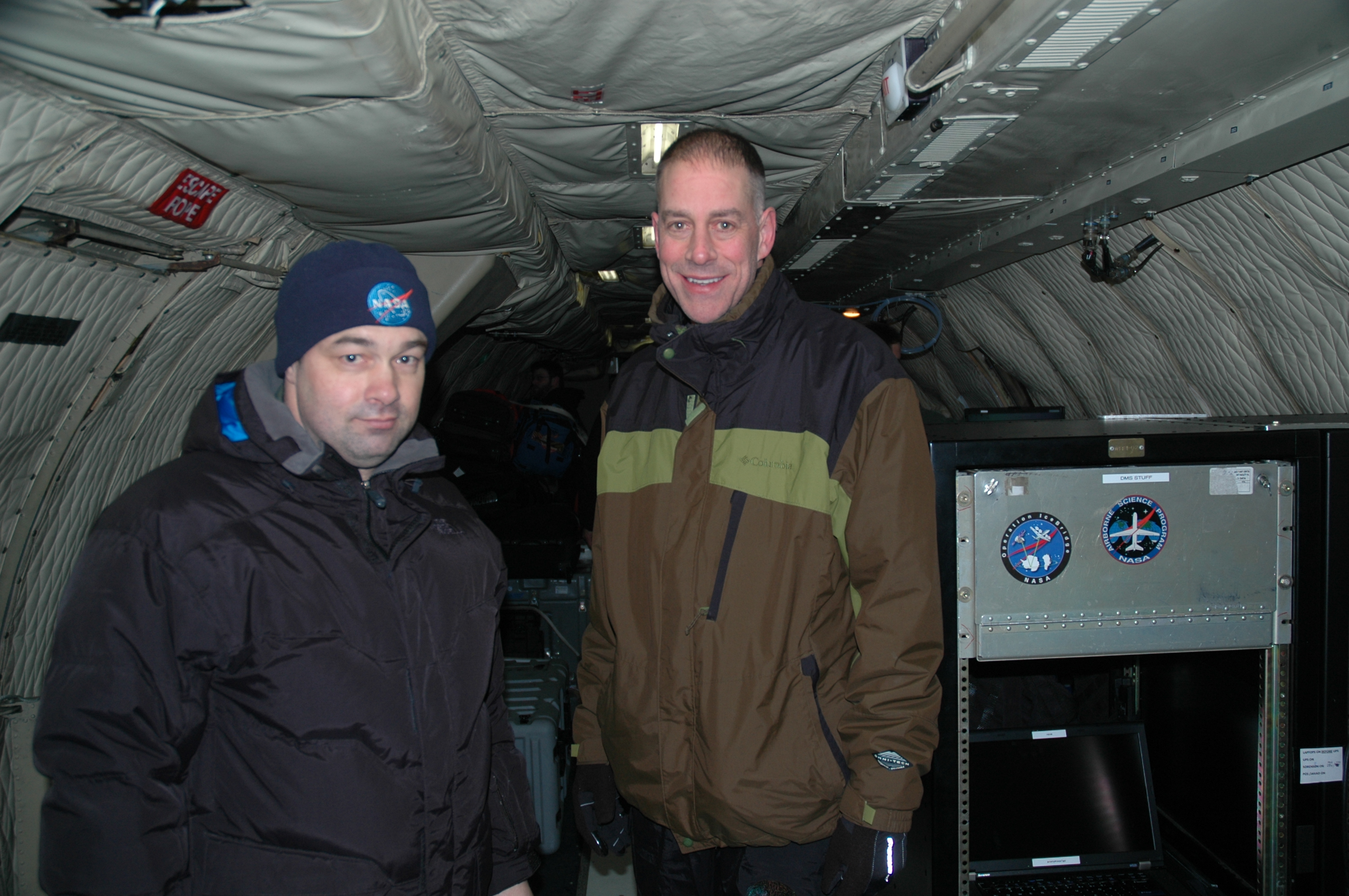 Mark Buesing stands inside the P-3 Orion with Michael Studinger, the project scientist. Fairbanks, Alaska.