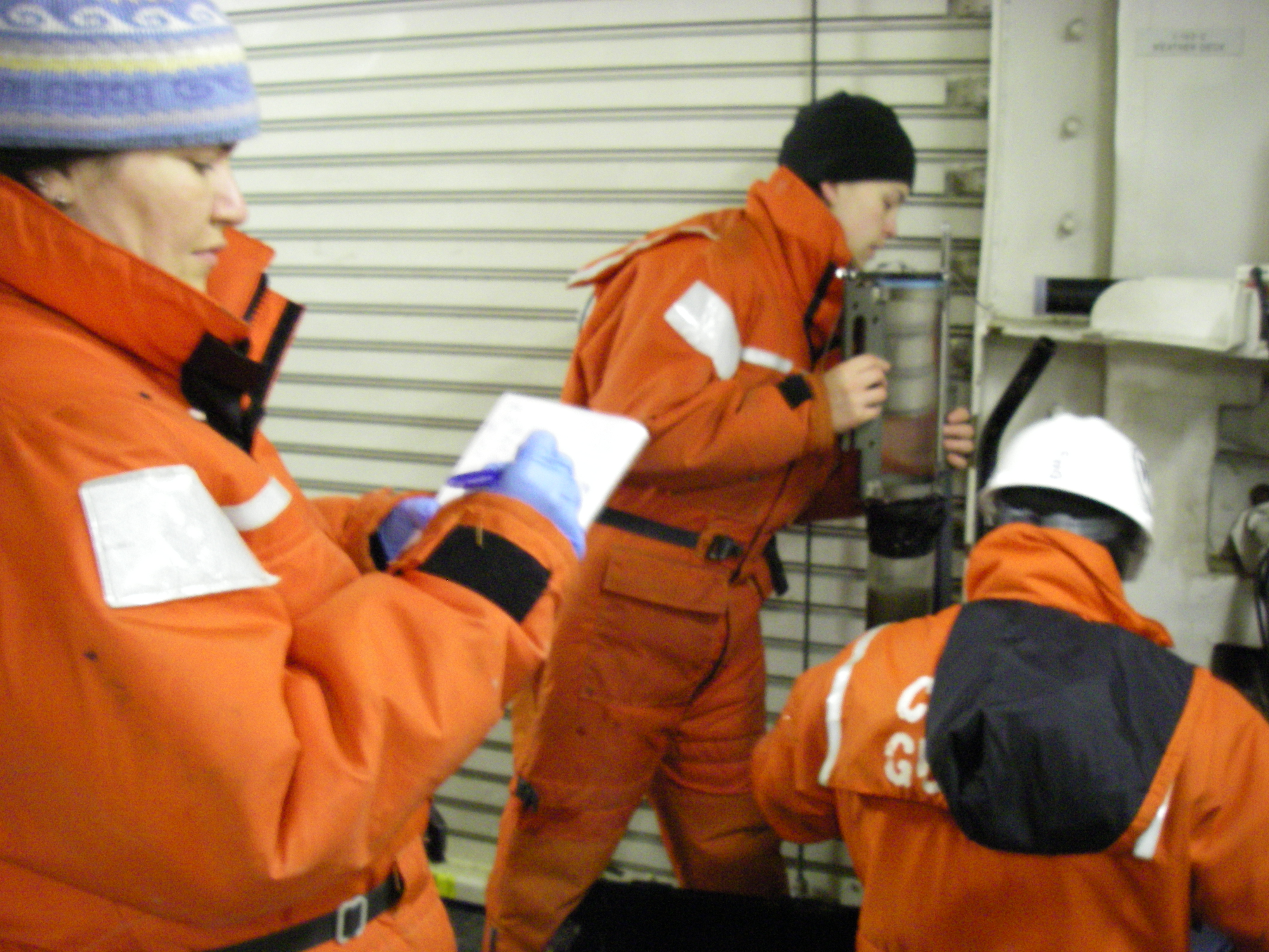 Recording the lengths, as the core tubes are being measured. Inside the science lab on the USCGC Healy icebreaker, on the Bering Sea.