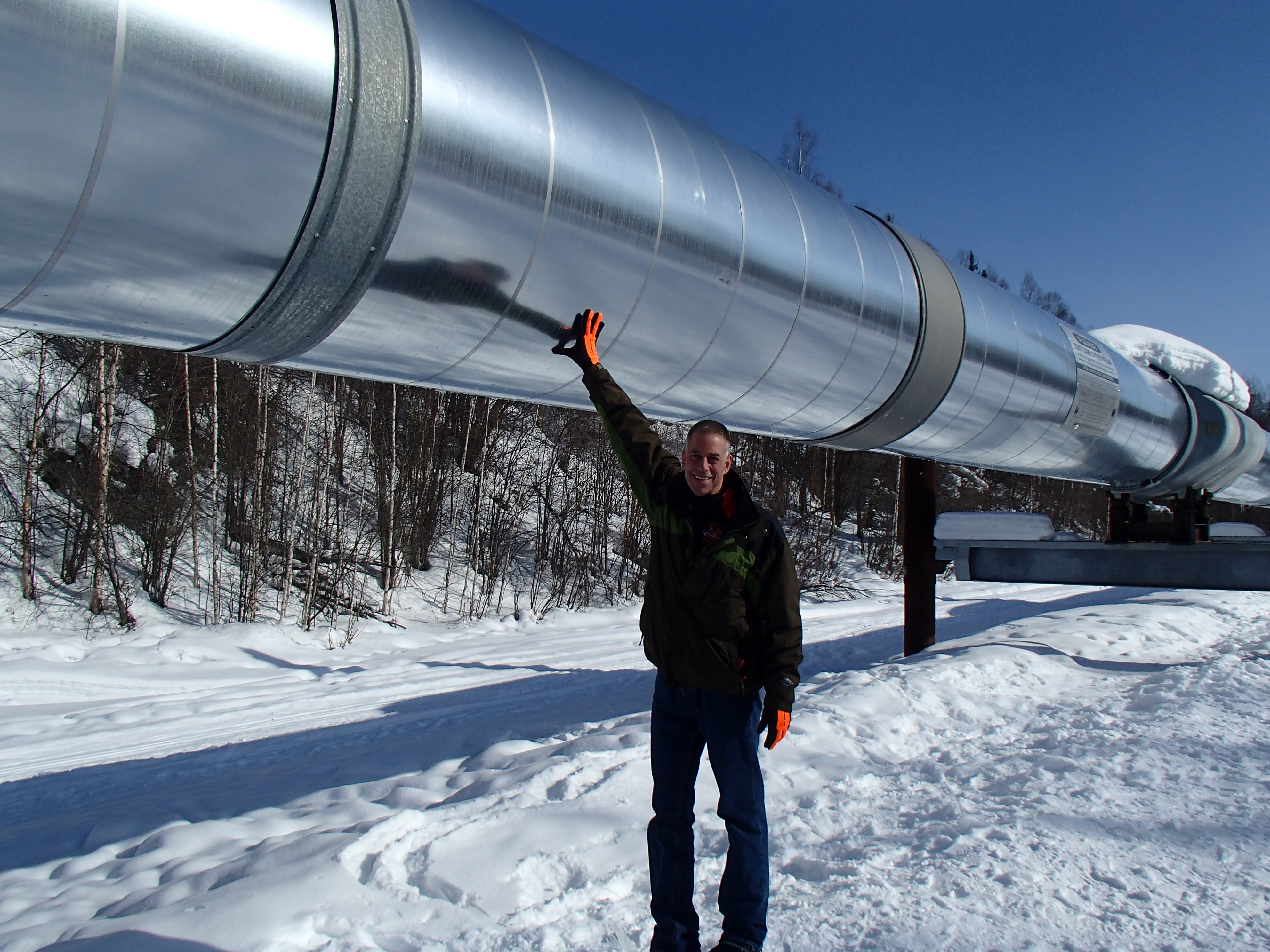 Mark Buesing poses with the 800 mile Trans-Alaskan pipeline. Fairbanks, Alaska.