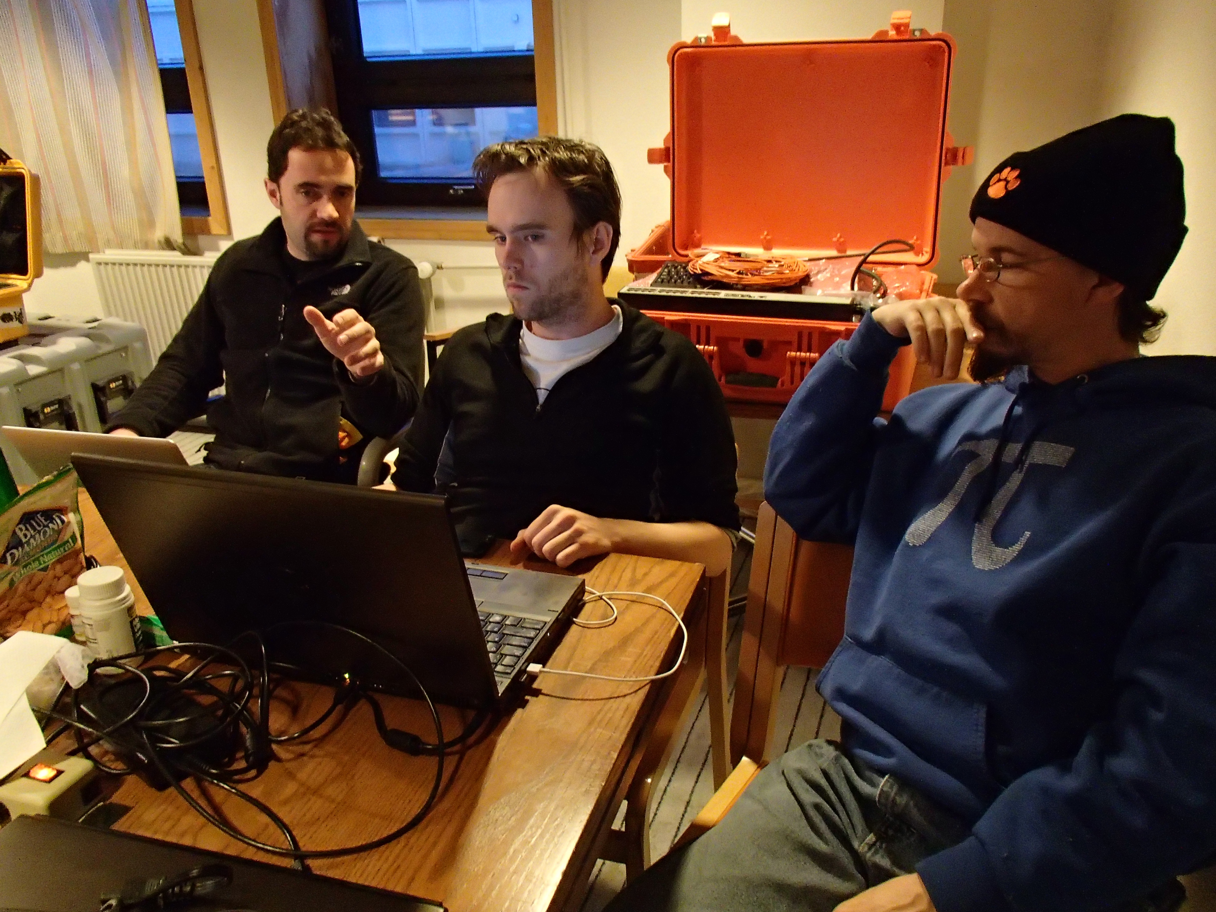 Logan Smith, in the middle, works with two of his team members to solve a problem. Kangerlussuaq, Greenland.