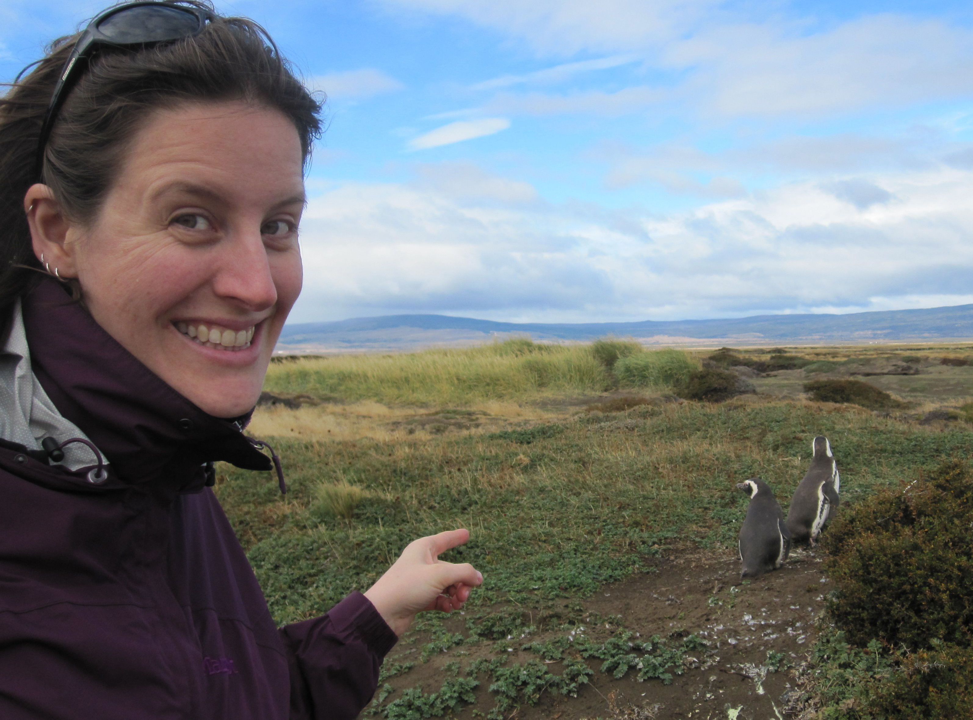 Amber Lancaster points to some Magellanic Penguins. Seno Otway, Chile.