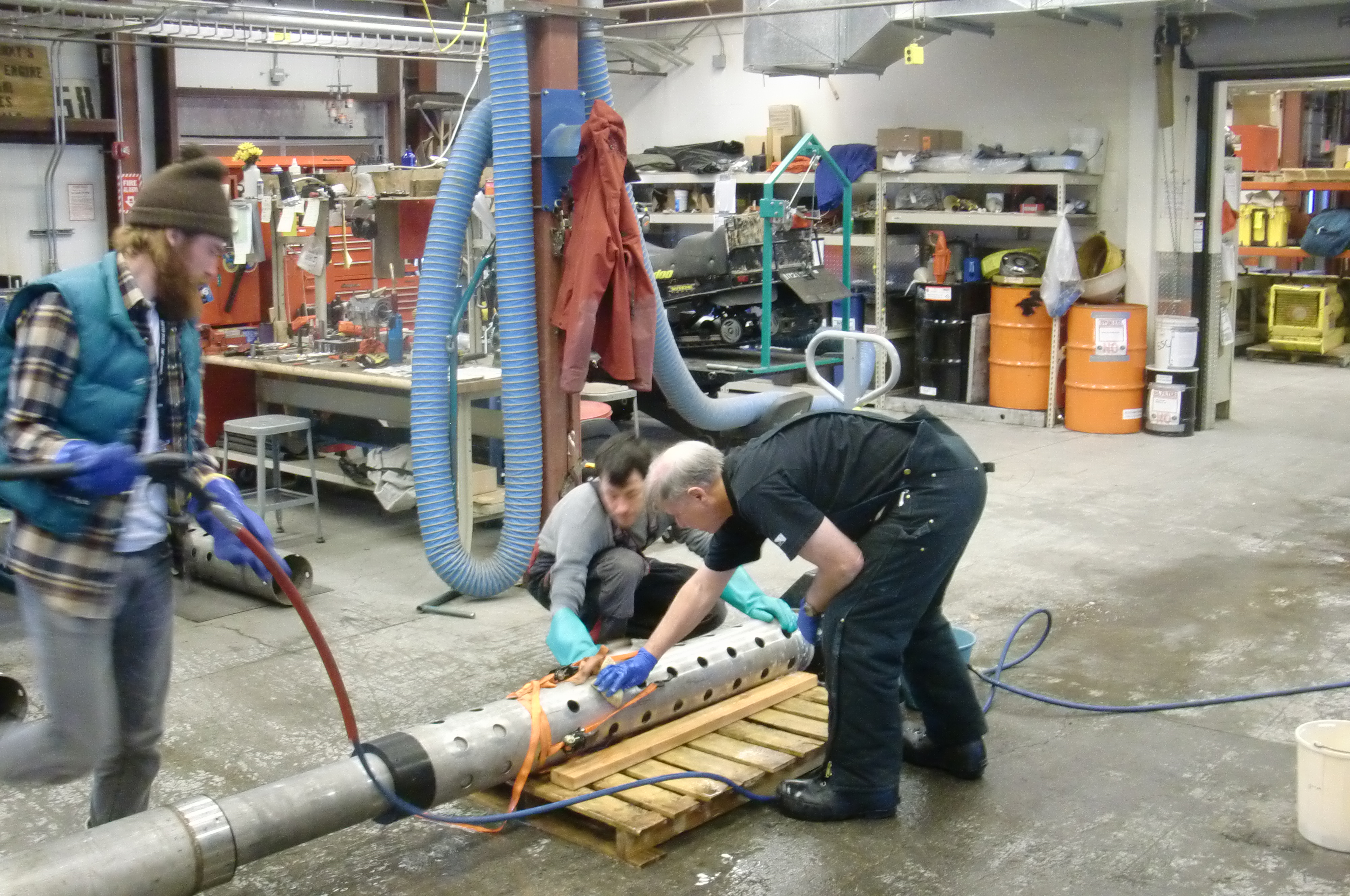 Ross Powell cleans the percussion corer hammer. McMurdo Station, Antarctica.