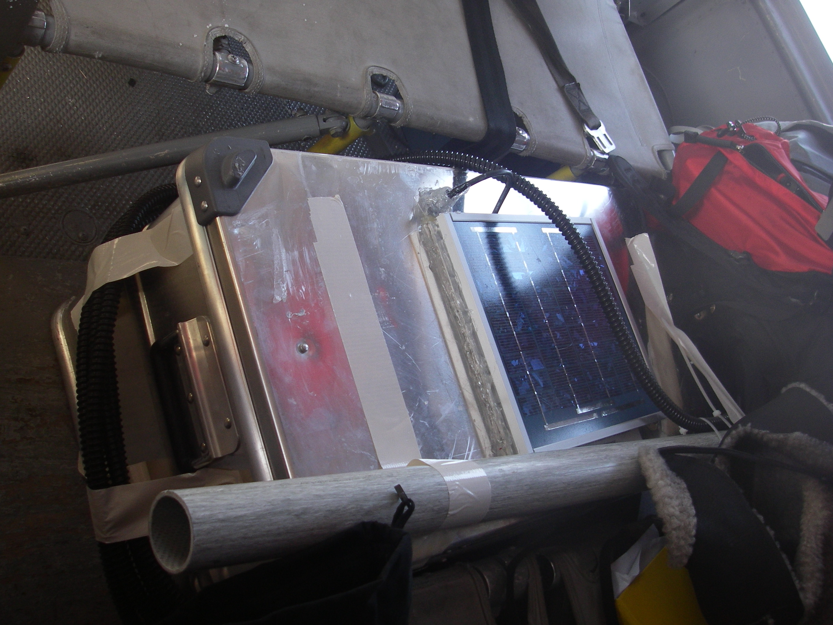 The GPS remote buoy in the helicopter before deployment. At the SEDNA/APLIS Ice Camp north of Prudhoe Bay, Alaska.