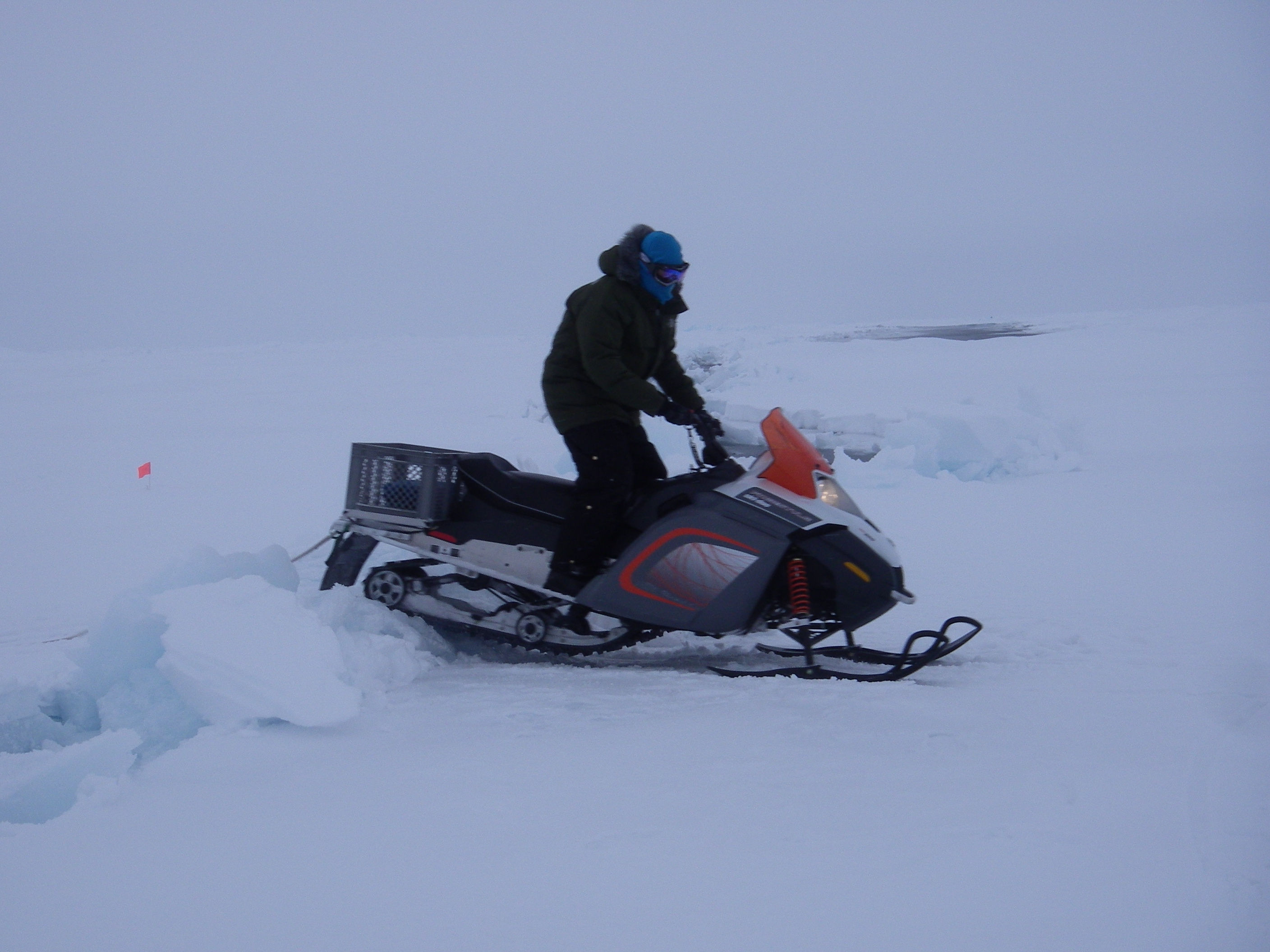 Dr. Andrew Roberts crosses a refrozen lead in the ice with an equipment sled and snowmobile. At the SEDNA/APLIS Ice Camp north of Prudhoe Bay, Alaska.