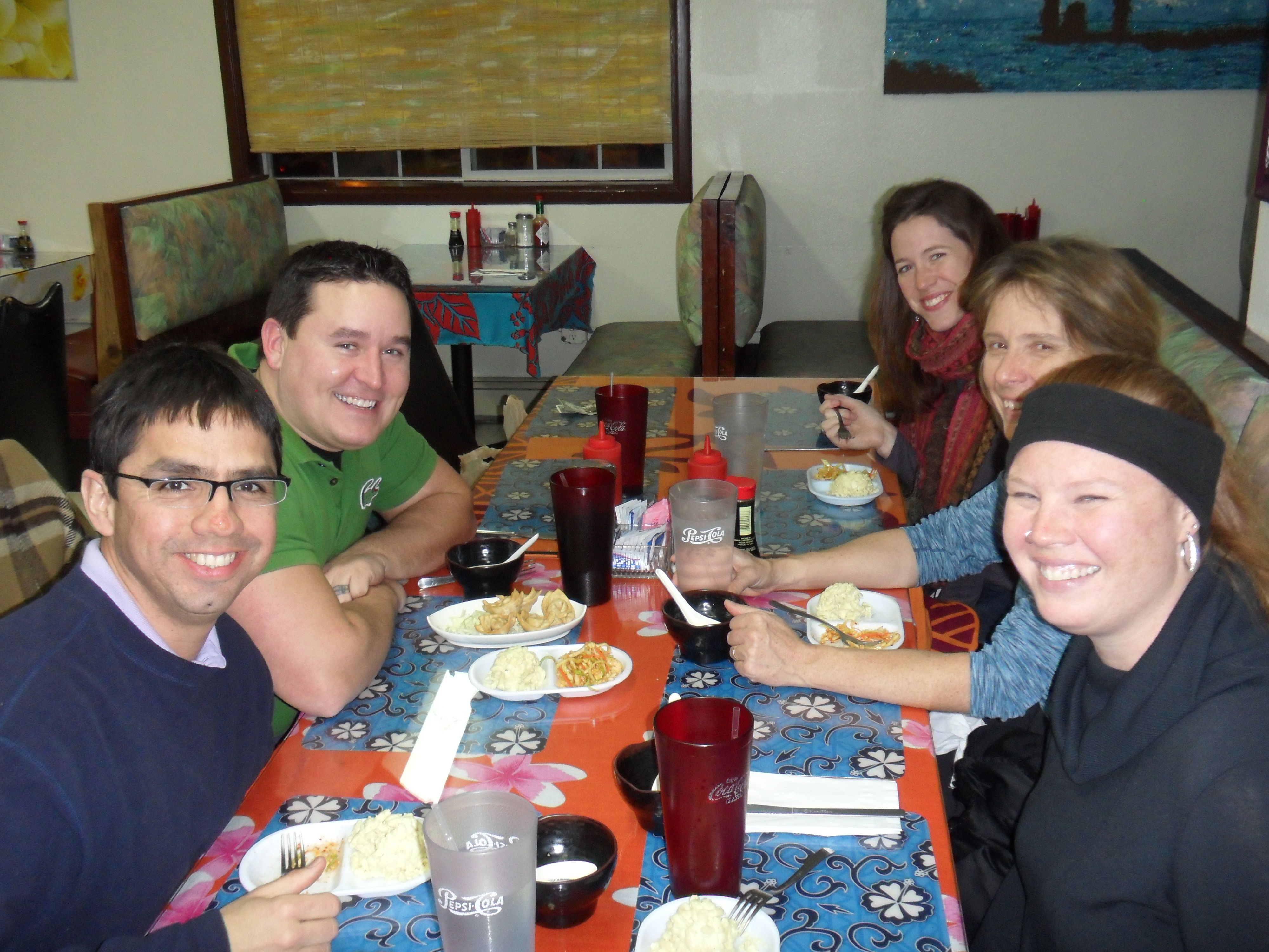 During PolarTREC Orientation, Susan Steiner has a meal with PolarTREC teachers Juan Botella, Brian DuBay, Hillary Brown, Lisa Seff, and researcher Samantha Hansen. Fairbanks, Alaska.
