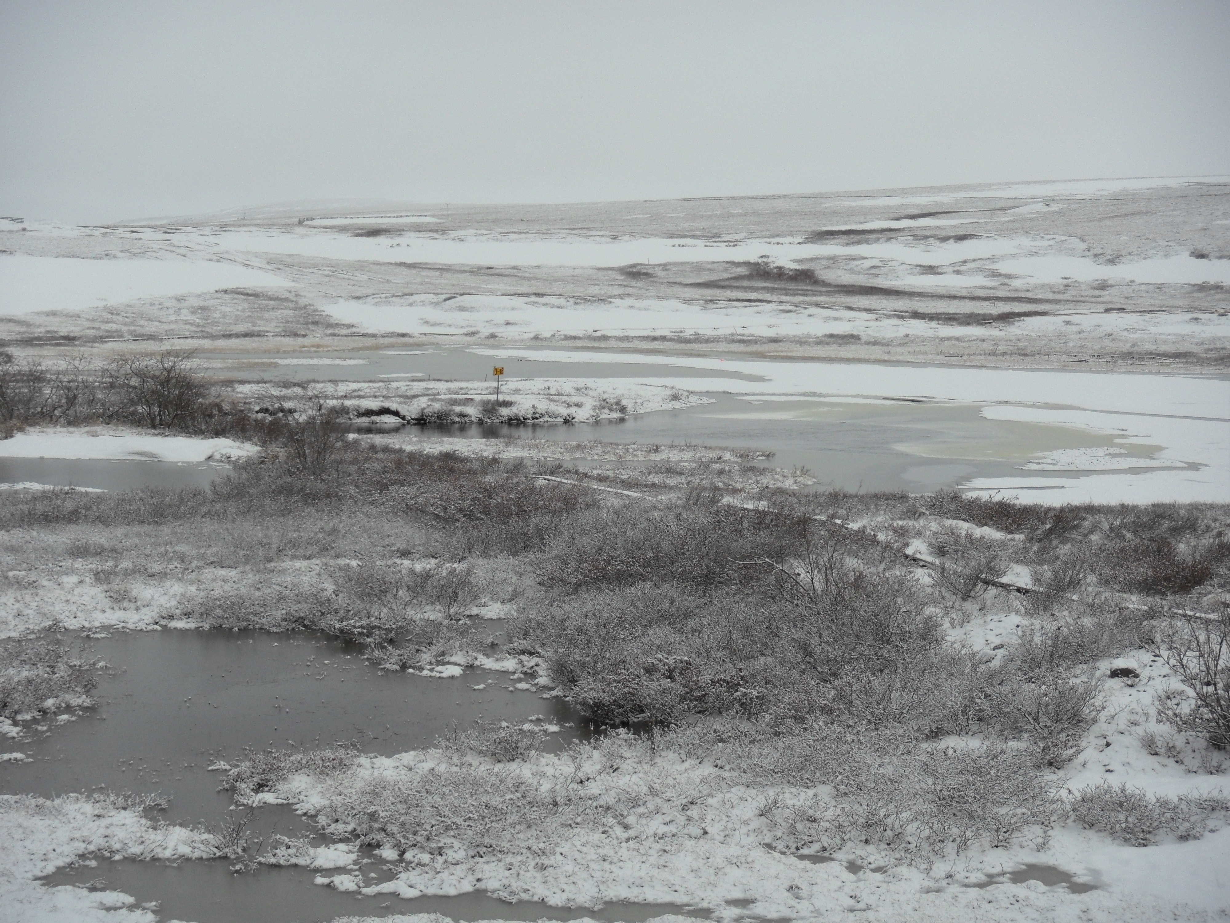 A view across Toolik Lake with fresh snow falling. Toolik Field Station, Alaska.