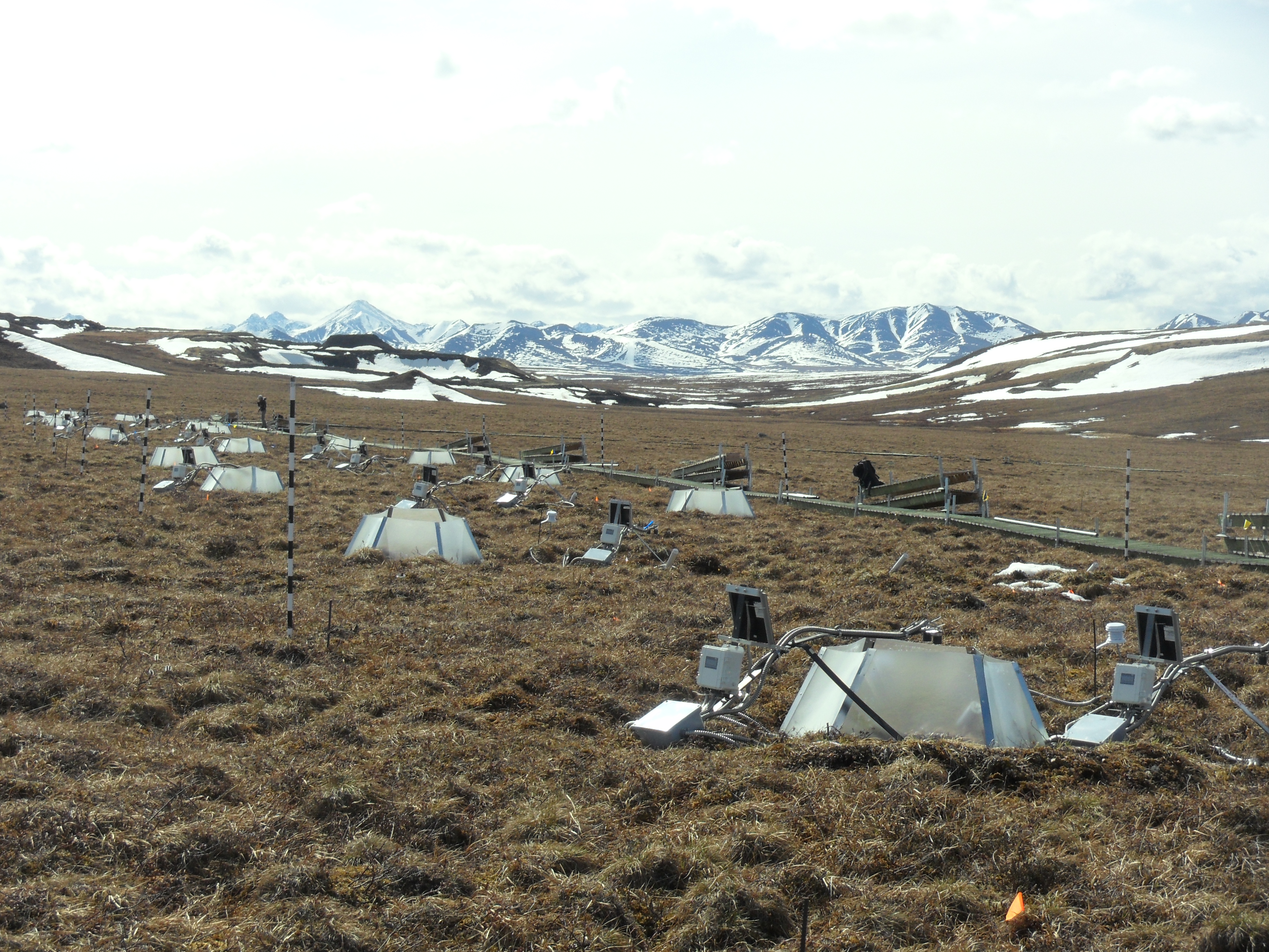 A view of plots with mountains in the background. At the Imnavait Creek Permanent Vegetation Plots near Toolik Field Station, Alaska.