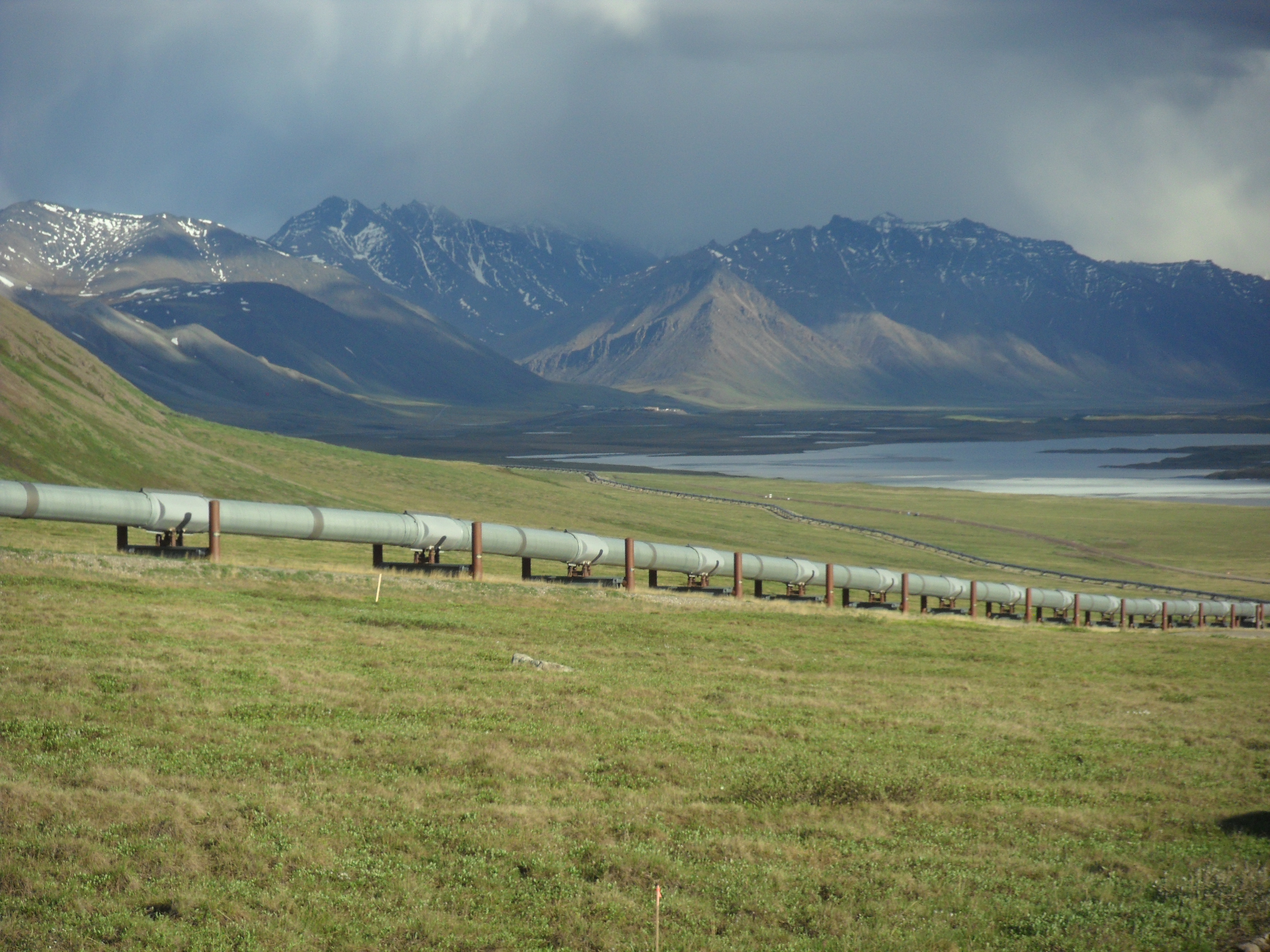 The Trans-Alaska Pipeline with the Brooks Range as a backdrop. Near Pump Station 4 on the Dalton Highway, Alaska.