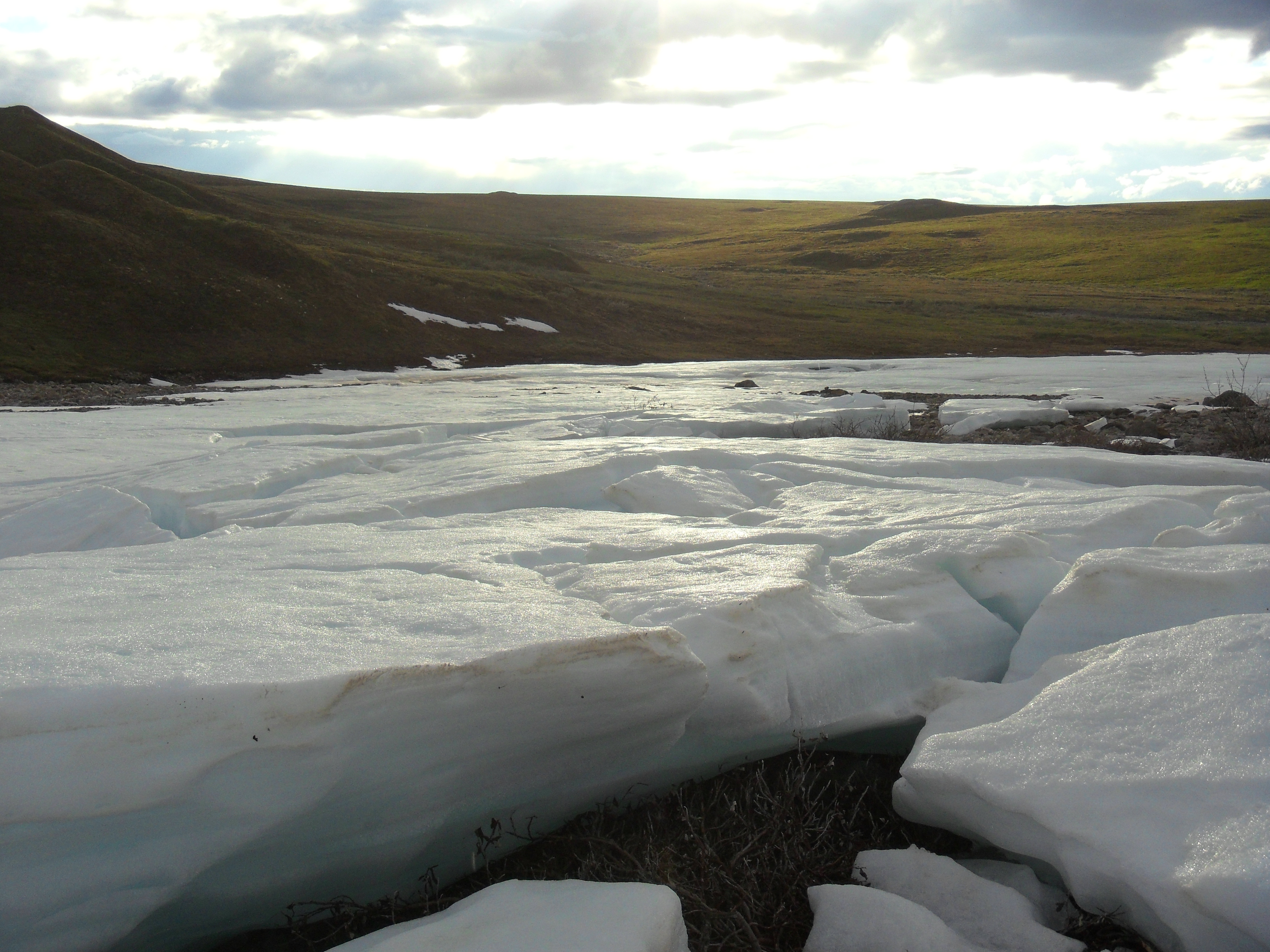 The aufeis in evening light around 10:00 pm. At the aufeis ice near Galbraith Lake, Alaska.