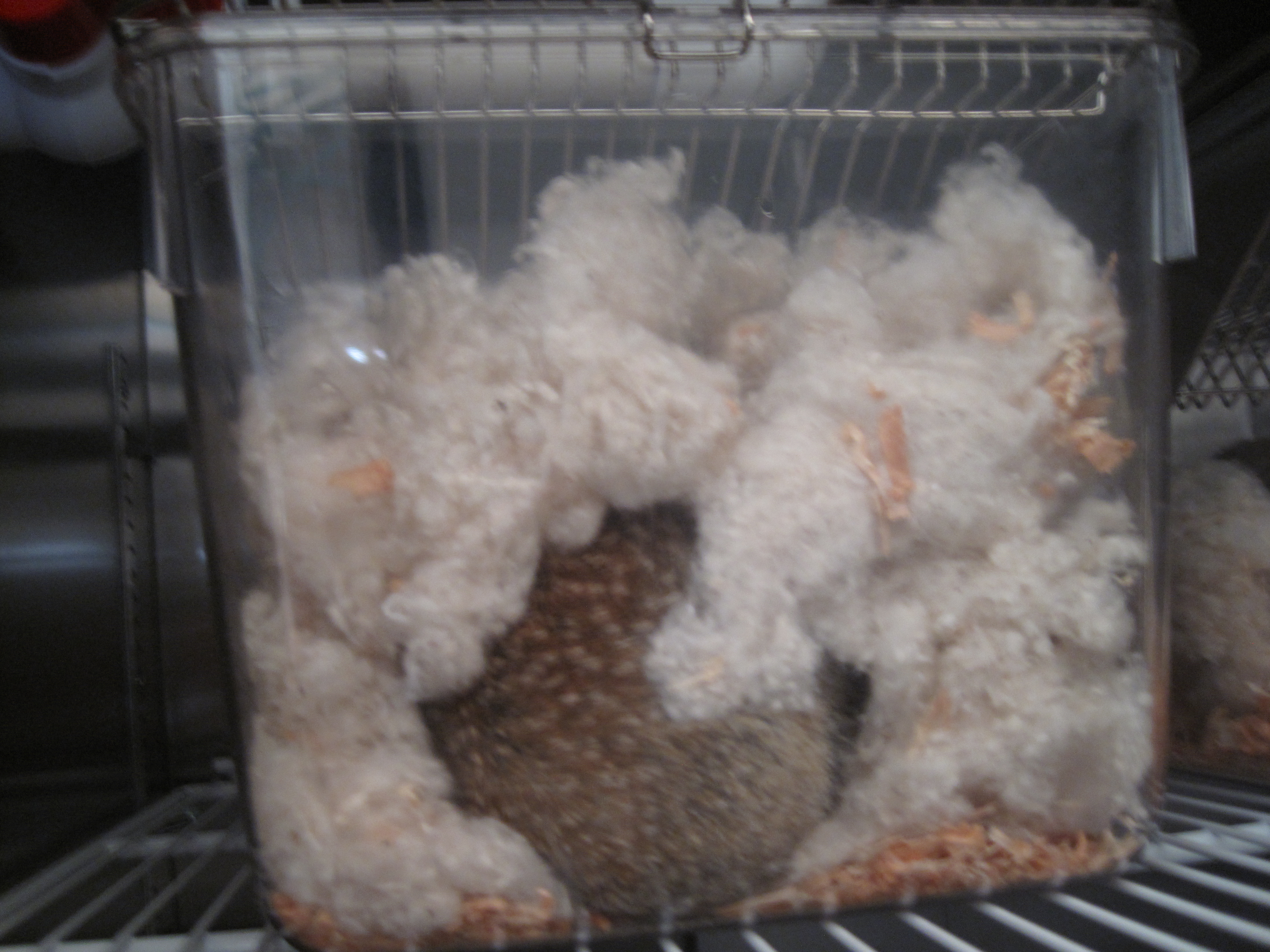 An Arctic ground squirrel made a nest in its bedding in the environmental chamber. Toolik Field Station, Alaska.