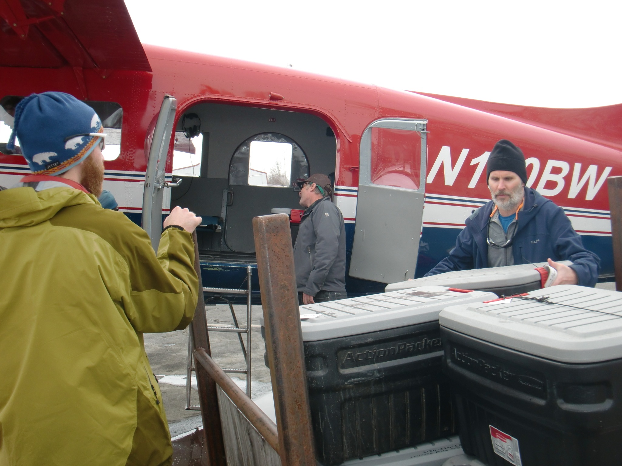 Ken Williams hands loaded bins to the pilot for loading. On the runway in Talkeetna, Alaska.