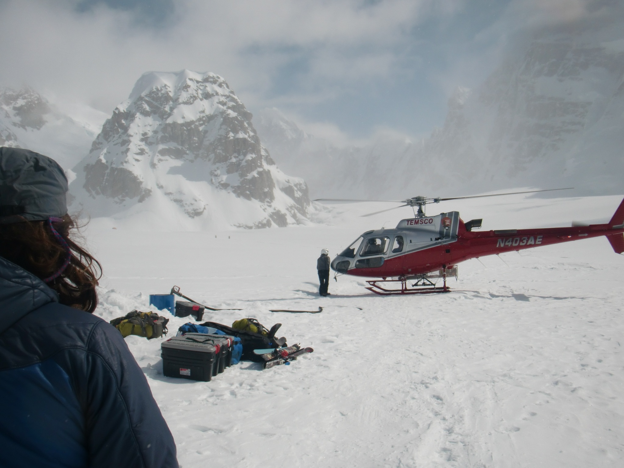 A helicopter just landed near the airstrip at basecamp. Helicopters are the transport method for getting the drill team and all their gear from basecamp to the drill site. Basecamp on Kahiltna Glacier, Denali National Park, Alaska.