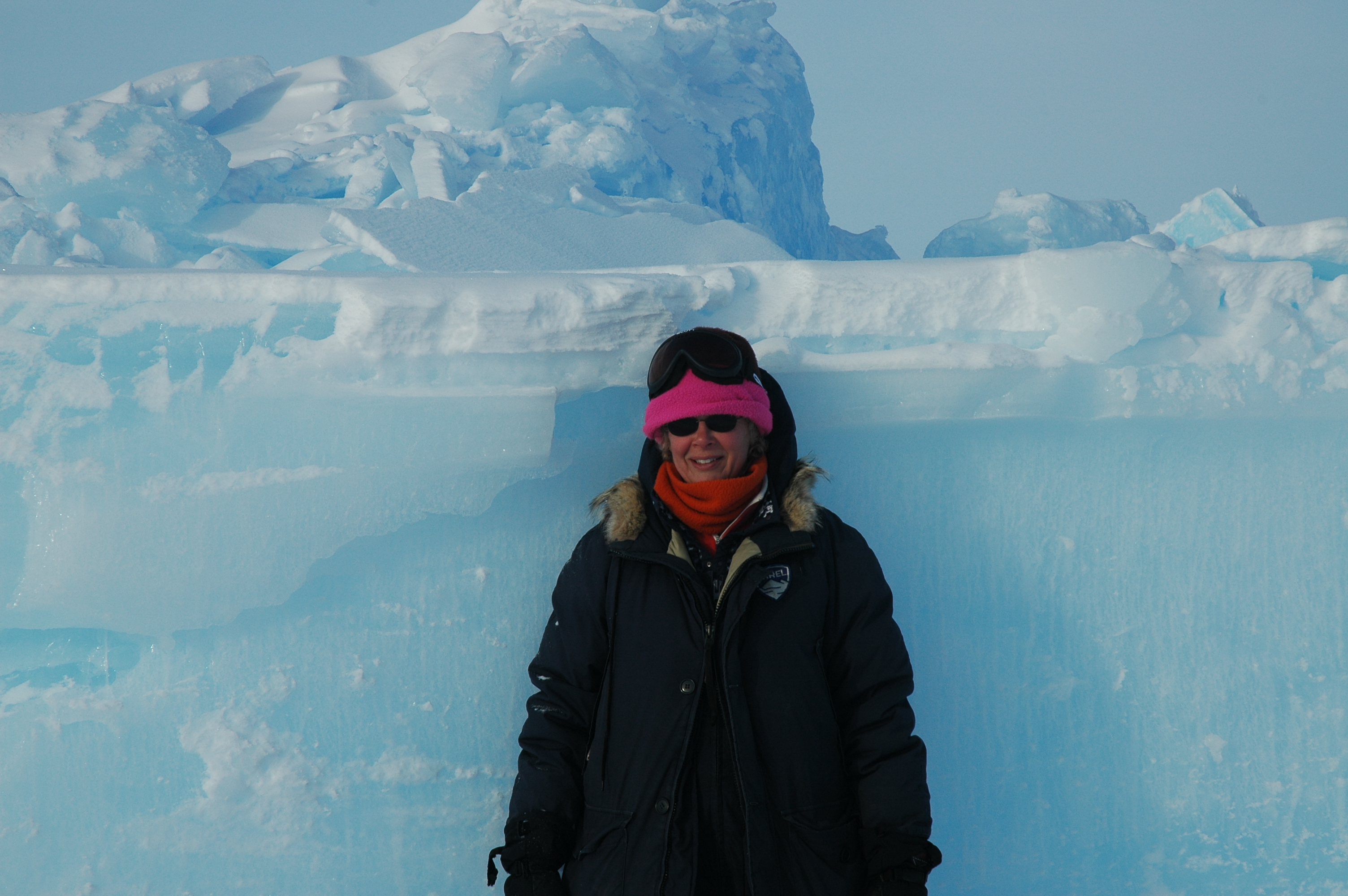Jackie Richter-Menge stands in front of a block of multiyear ice. At the SEDNA/APLIS Ice Camp north of Prudhoe Bay, Alaska.