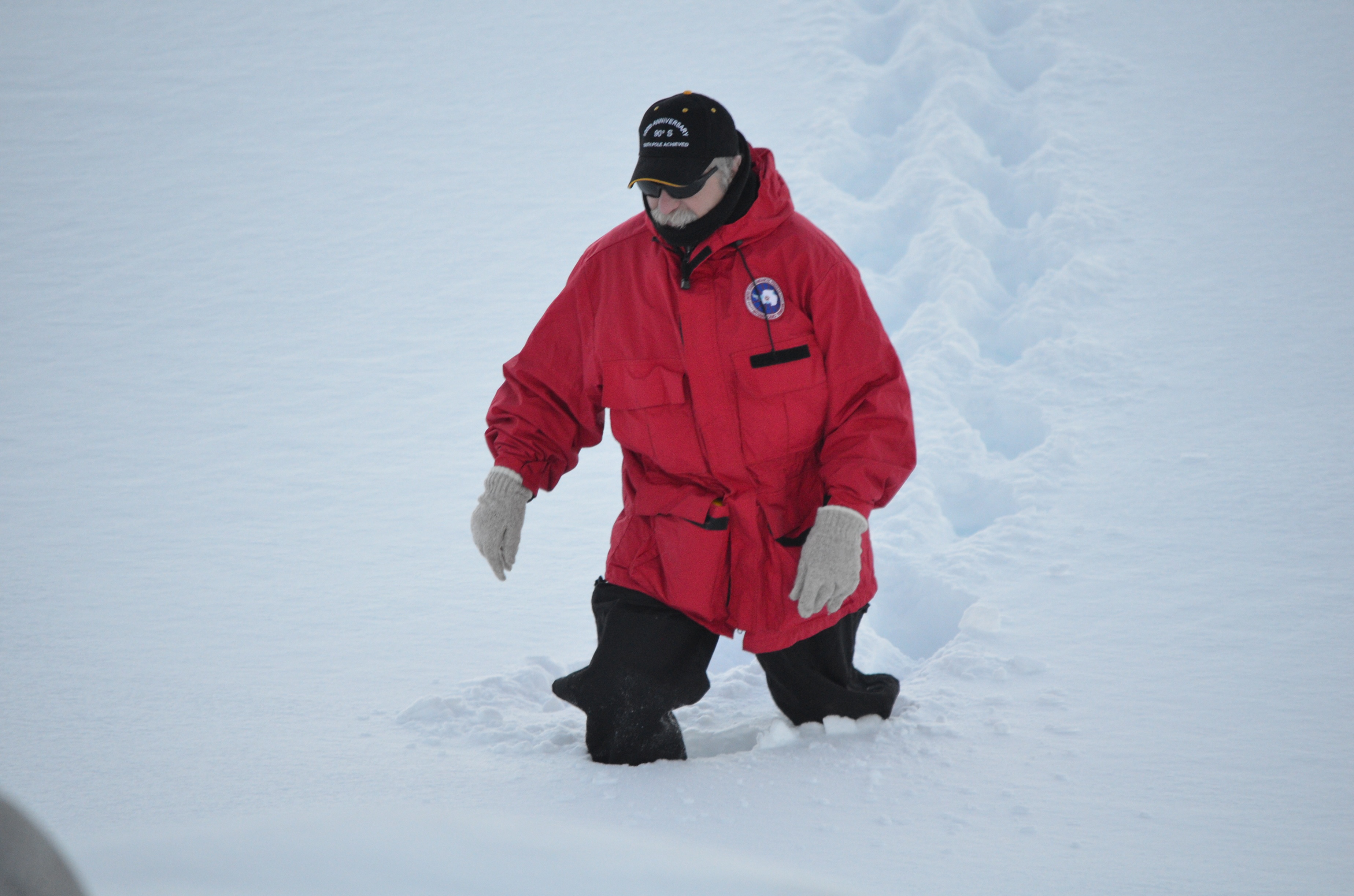 Dennis walks in deep snow behind Palmer Station. He is a pipefitter at the station. Palmer Station, Antarctica.