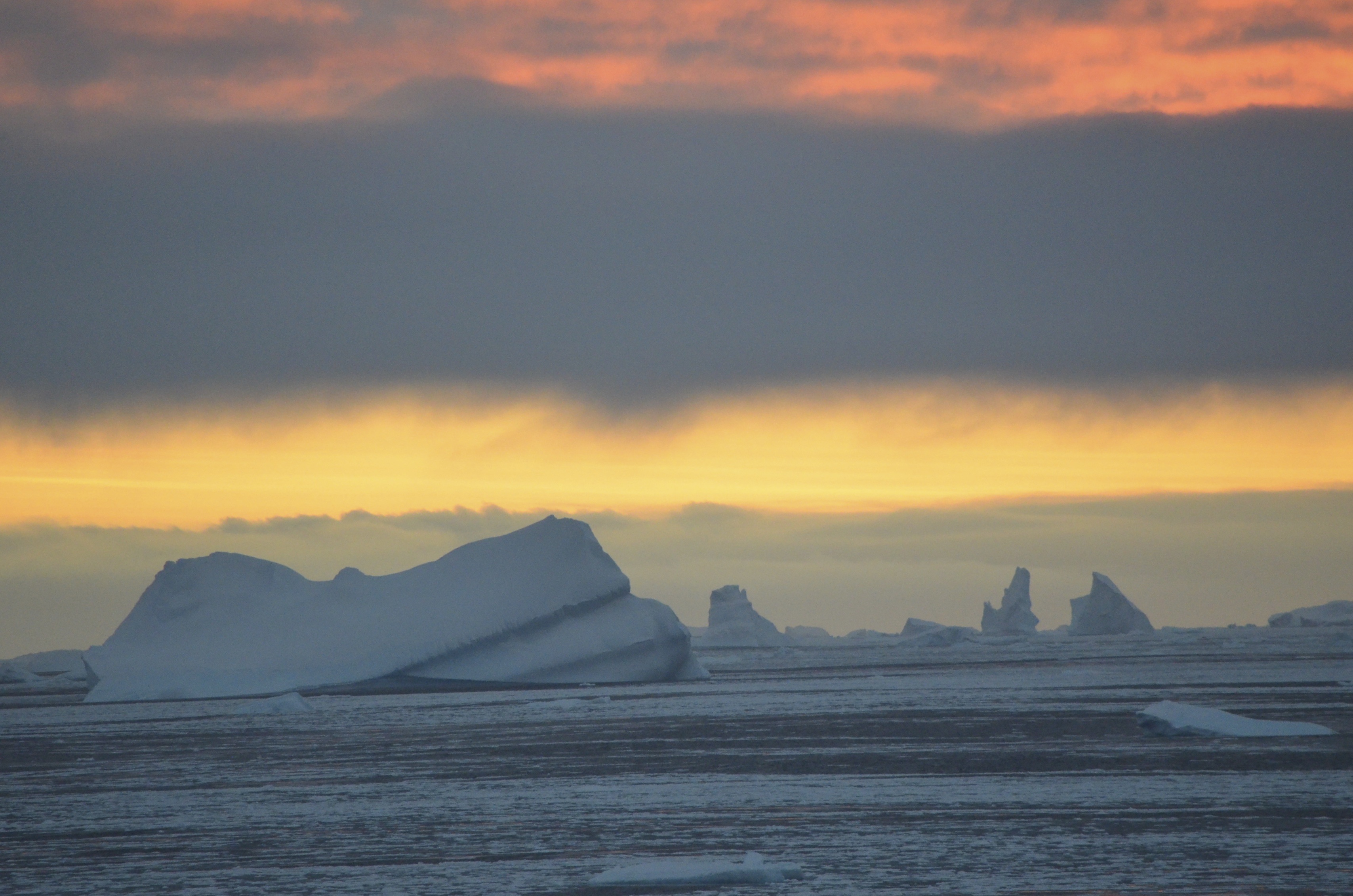 Sunrise in the Lemaire Channel with assorted icebergs.
