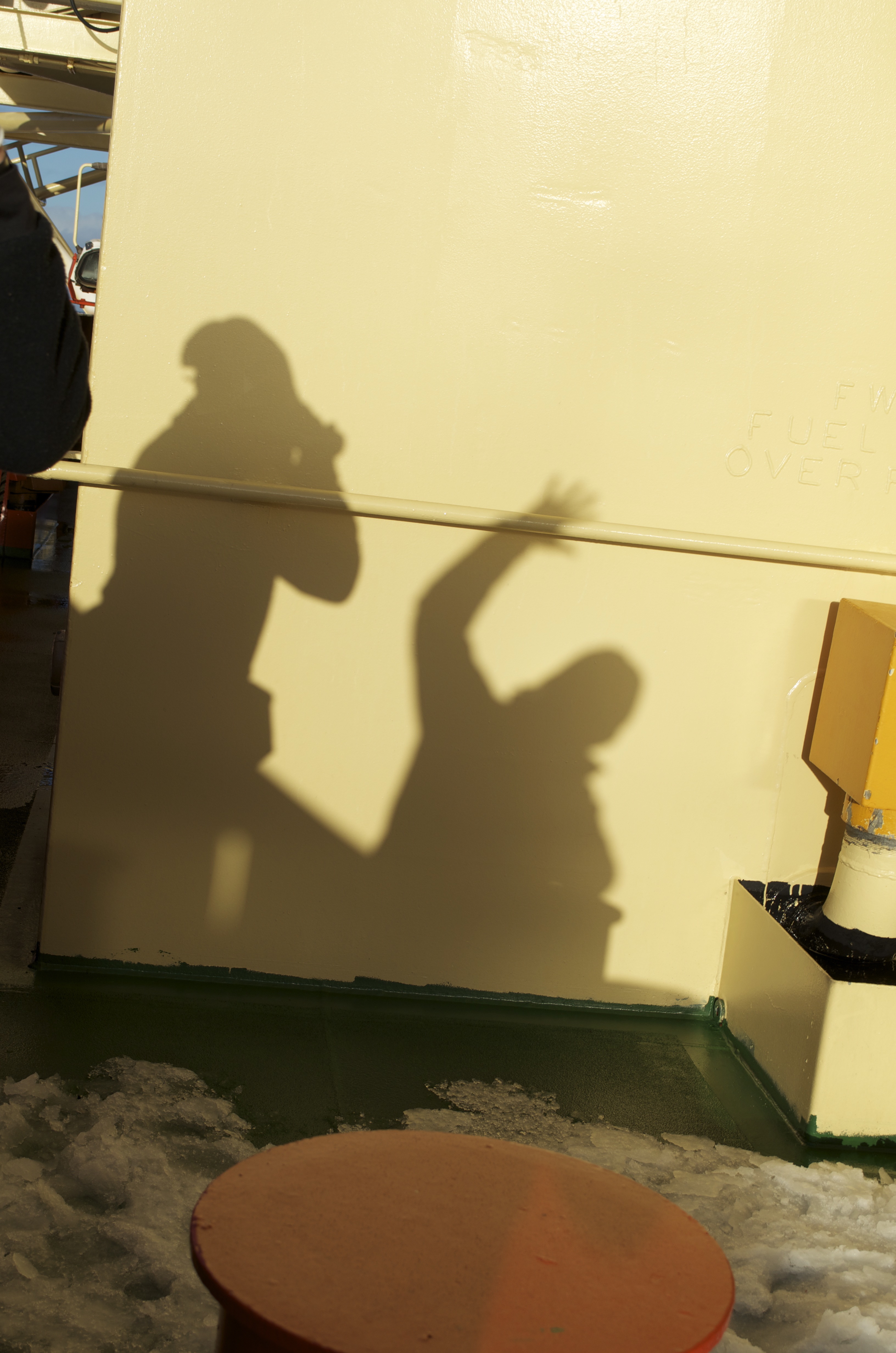 Team members make shadows on the deck of the Laurence M. Gould as it heads north, away from Antarctica. Paula Dell: "Hey Look! Shadows… that means sun! It felt great to feel the warmth of the high sun again." Aboard the RV Laurence M. Gould icebreaker.