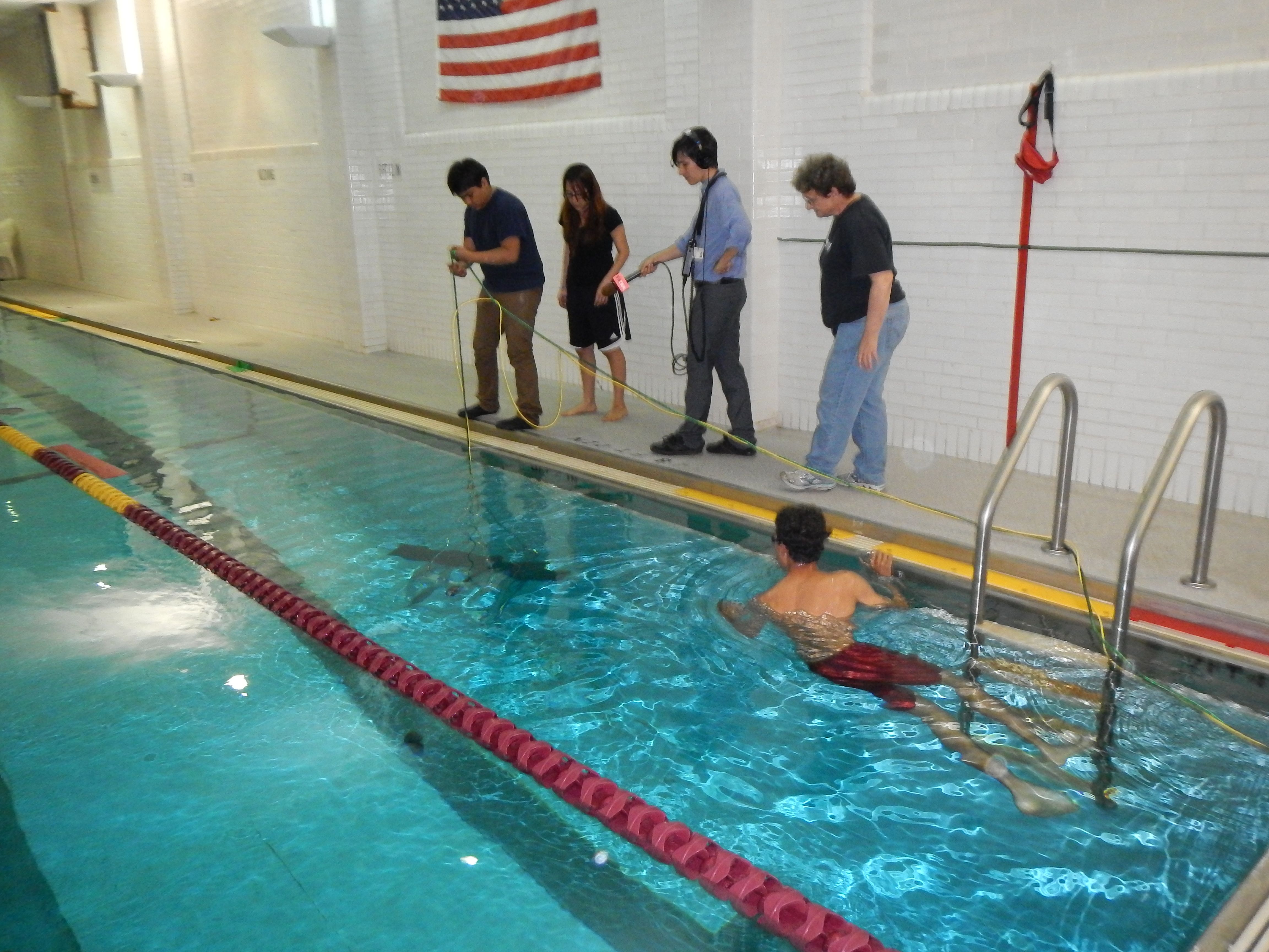 Francisco Flores, Liliana Diaz, WBEZ (NPR) reporter Lewis Wallace, and Paula Dell watch Fish Spy in the pool. Joseph Zeigler is in the pool filiming. Lindblom Math & Science Academy Pool, Chicago, Illinois.
