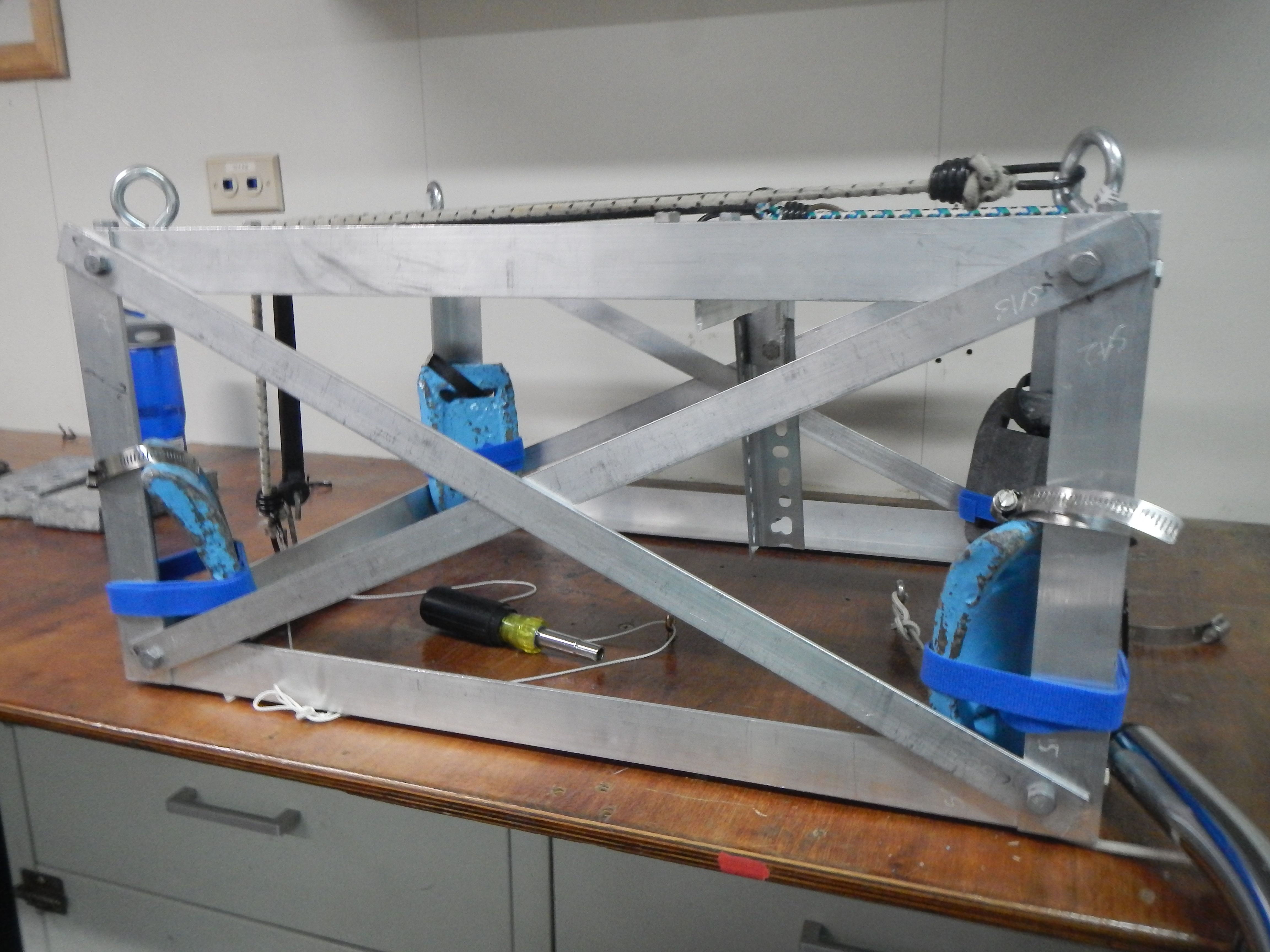 Paula Dell and team members attached dive weights with hose clamps on the top and velcro on the bottom. Aboard the RV Laurence M. Gould icebreaker.