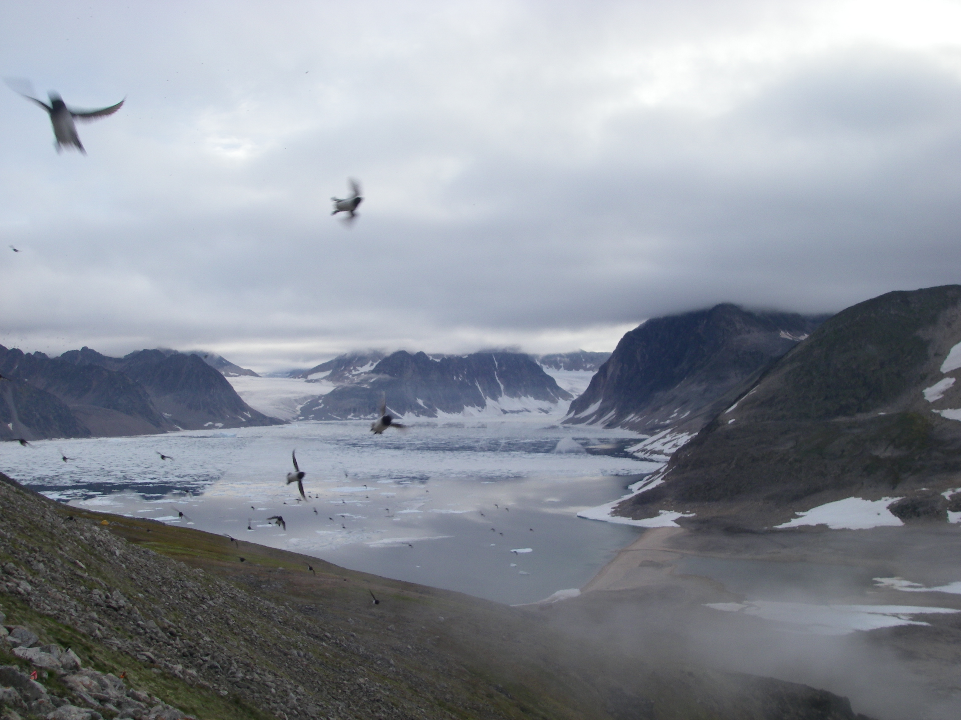 Little Auks soaring above the bay and Kap Hoegh, Greenland.