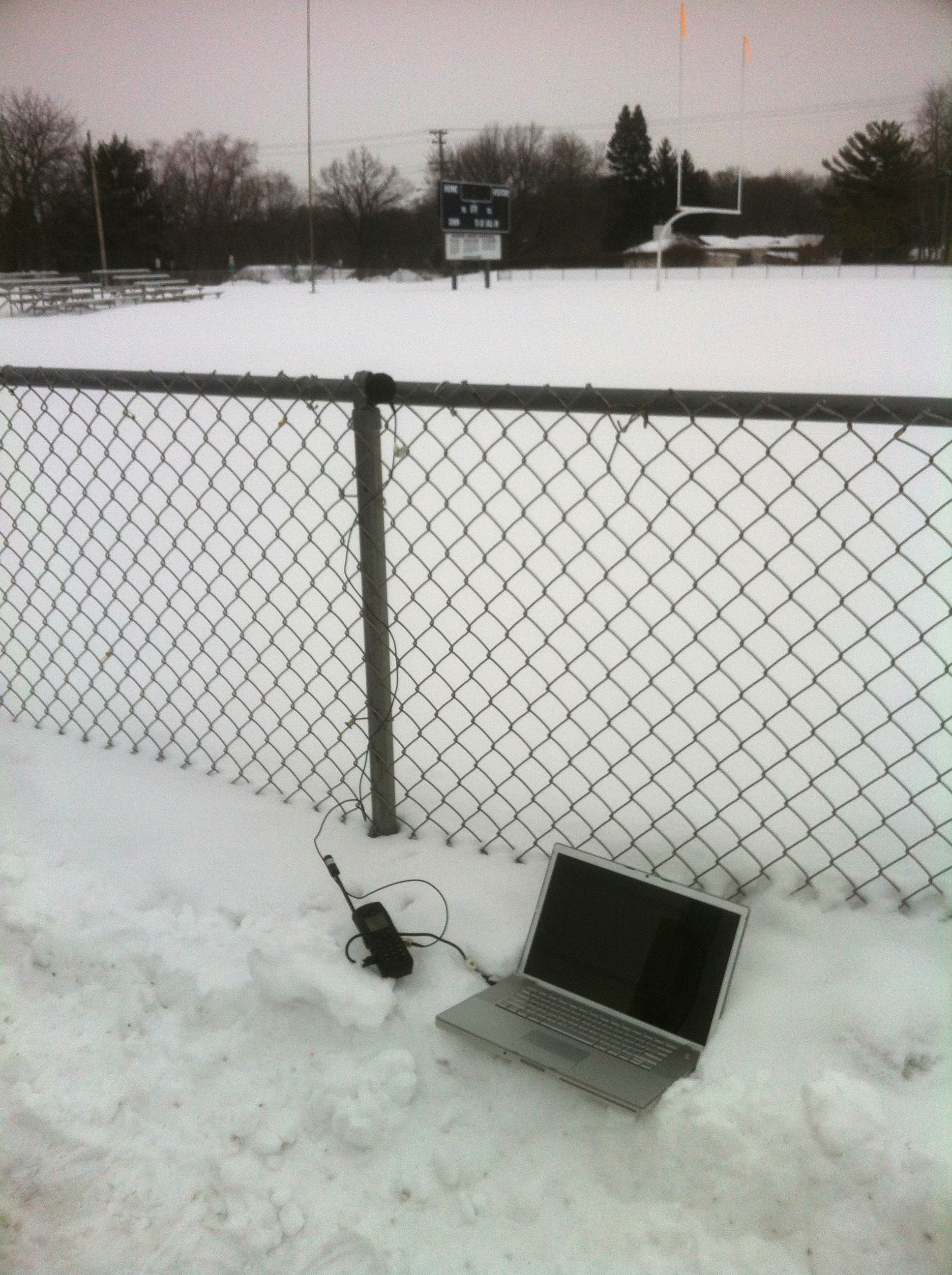 Testing the satellite phone setup at Monona Grove High School in Monona, Wisconsin. Monona Grove High School in Monona, Wisconsin.
