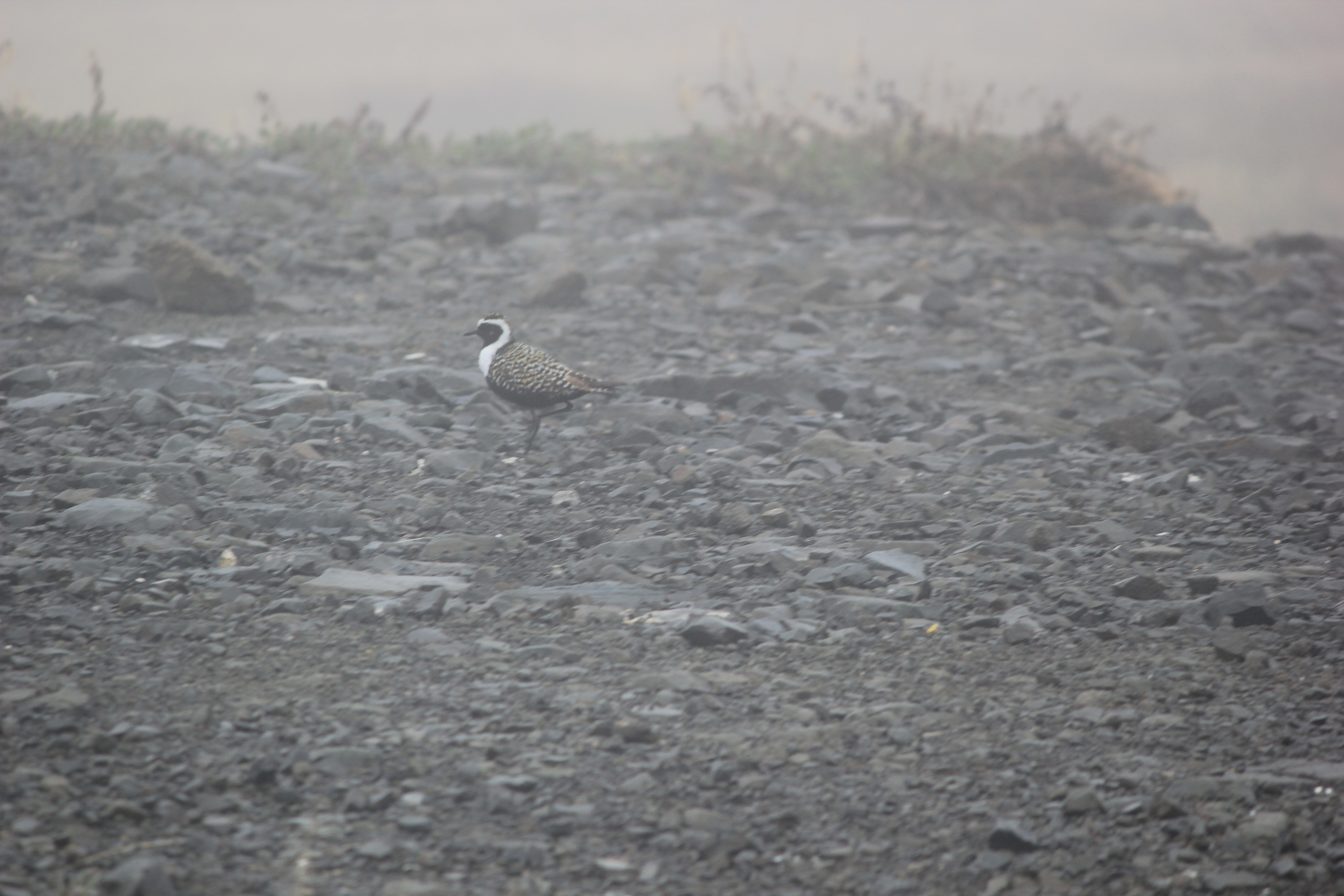 A black-bellied plover (P.squatarola) on a rocky bank in the fog. About 25 miles southwest of Toolik Lake, on the Sagavanirktok River, Alaska.