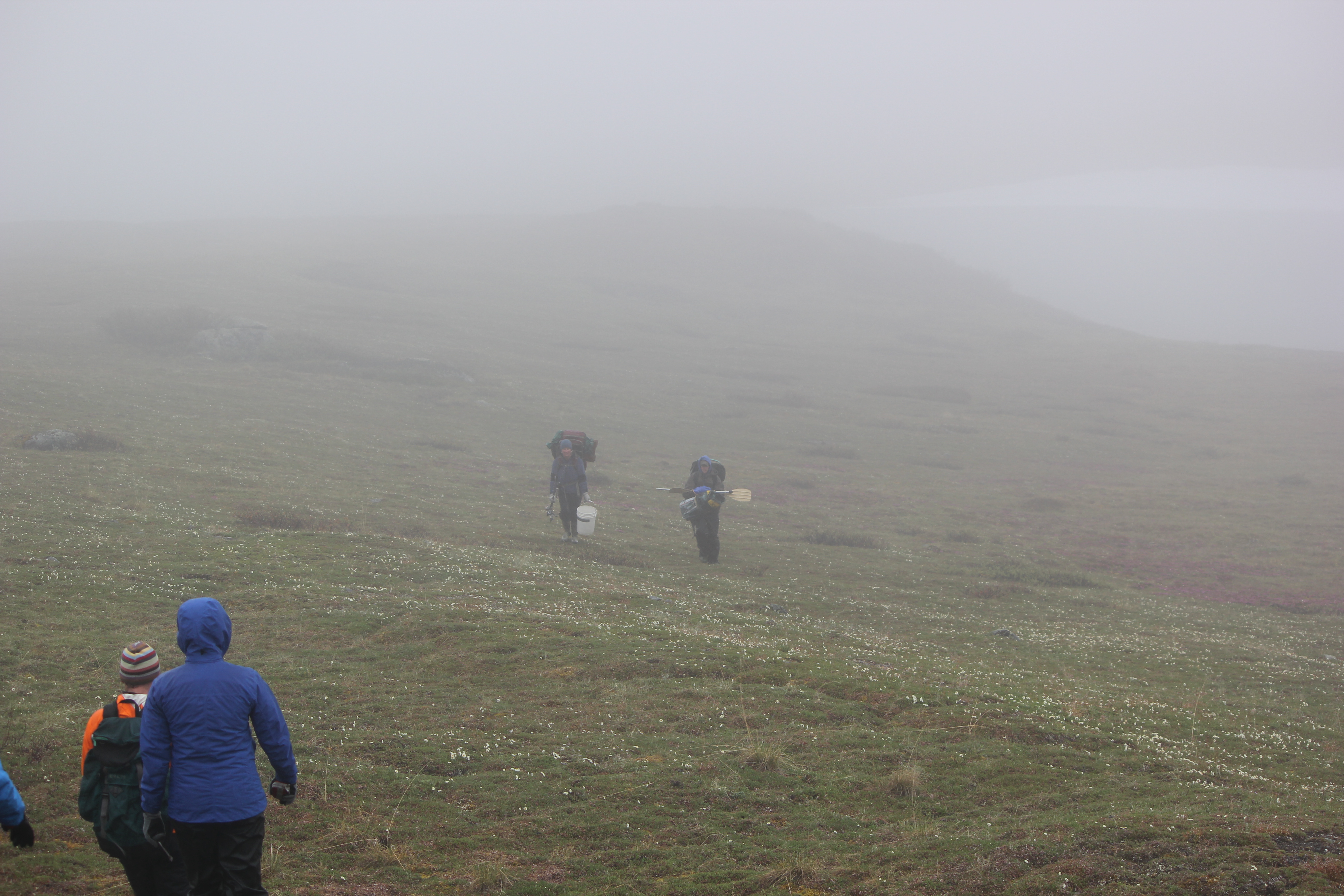 Research groups head to a tundra lake, carrying oars. About 25 miles southwest of Toolik Lake, on the Sagavanirktok River, Alaska.
