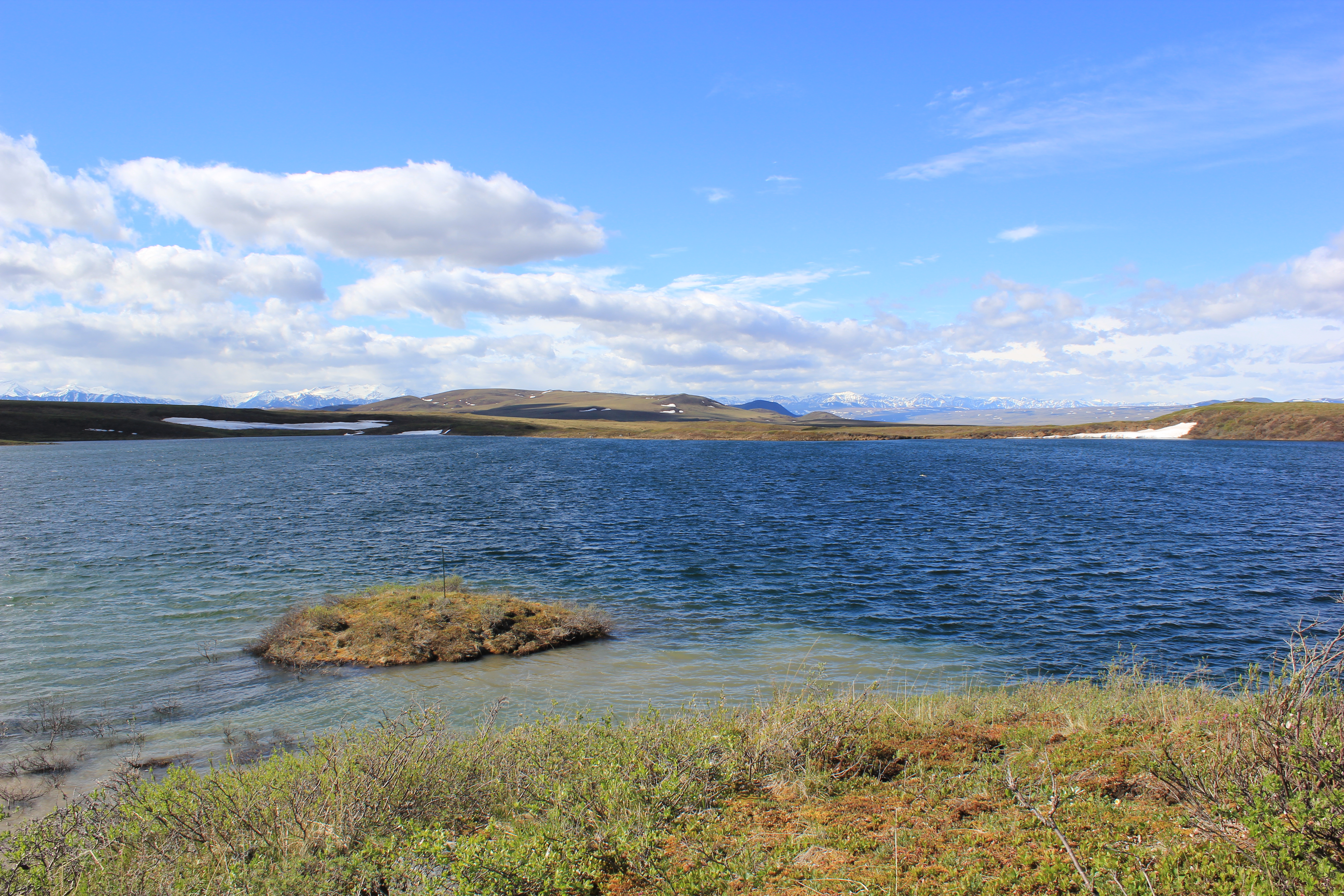 Blue lake with green edge and a small island. Toolik Field Station, Alaska.