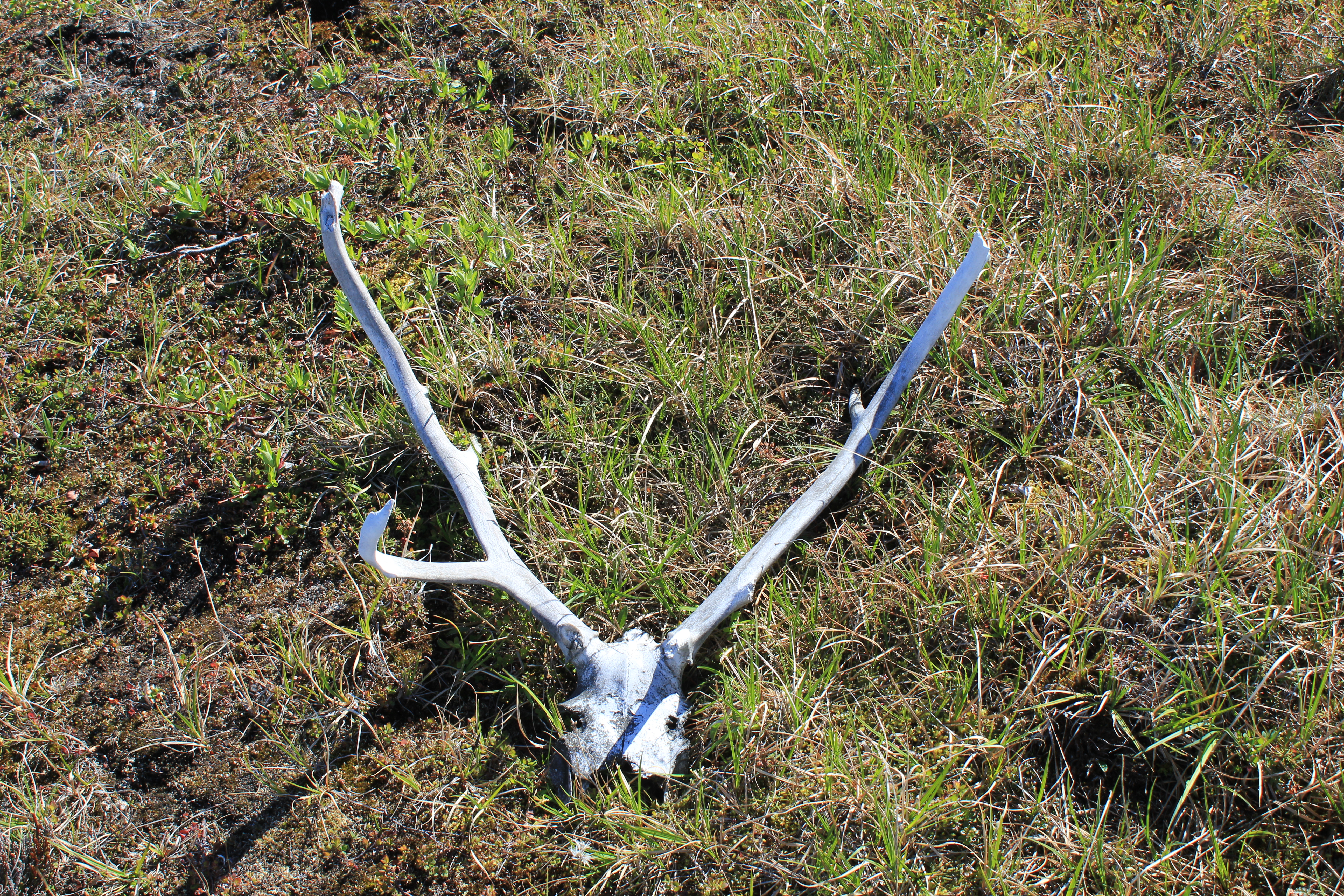 A caribou skull with antlers lying on the tundra. Toolik Field Station, Alaska.