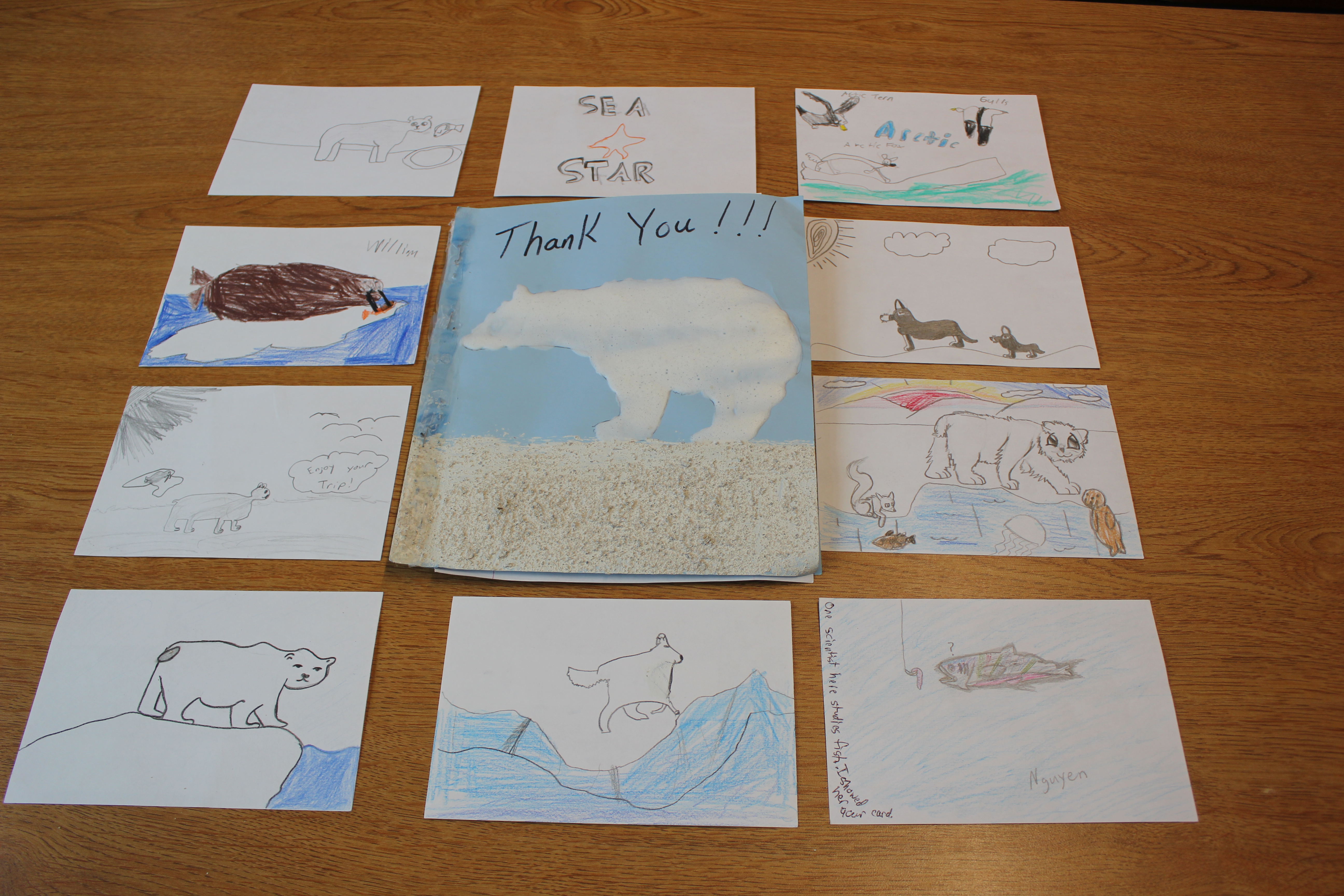 Postcards with a book in the center. Artwork by Croce Elementary School students. Toolik Field Station, Alaska.