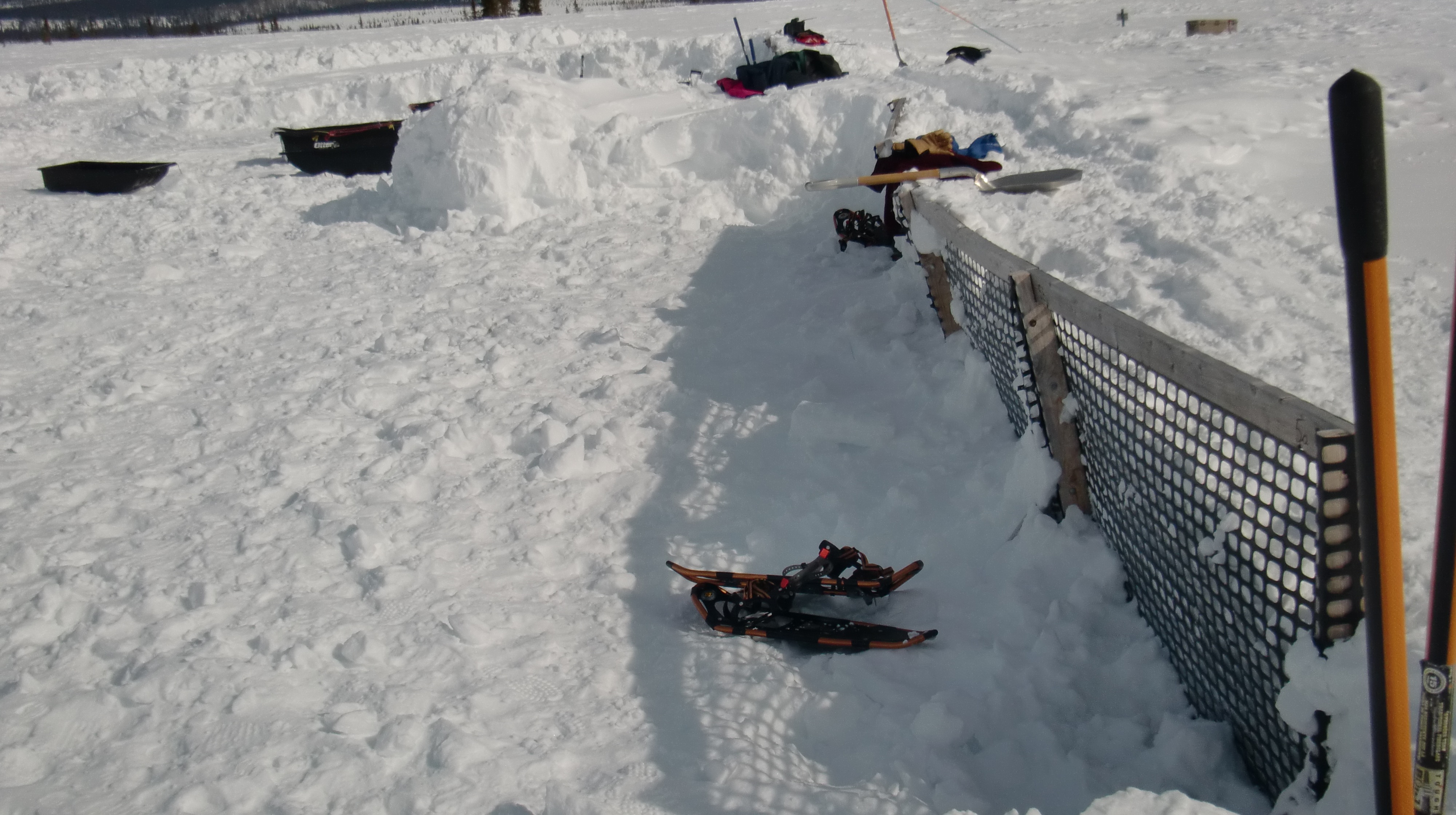 A view of the fence at Plot B after having been hand shoveled. At the CiPEHR site, near Healy, Alaska.