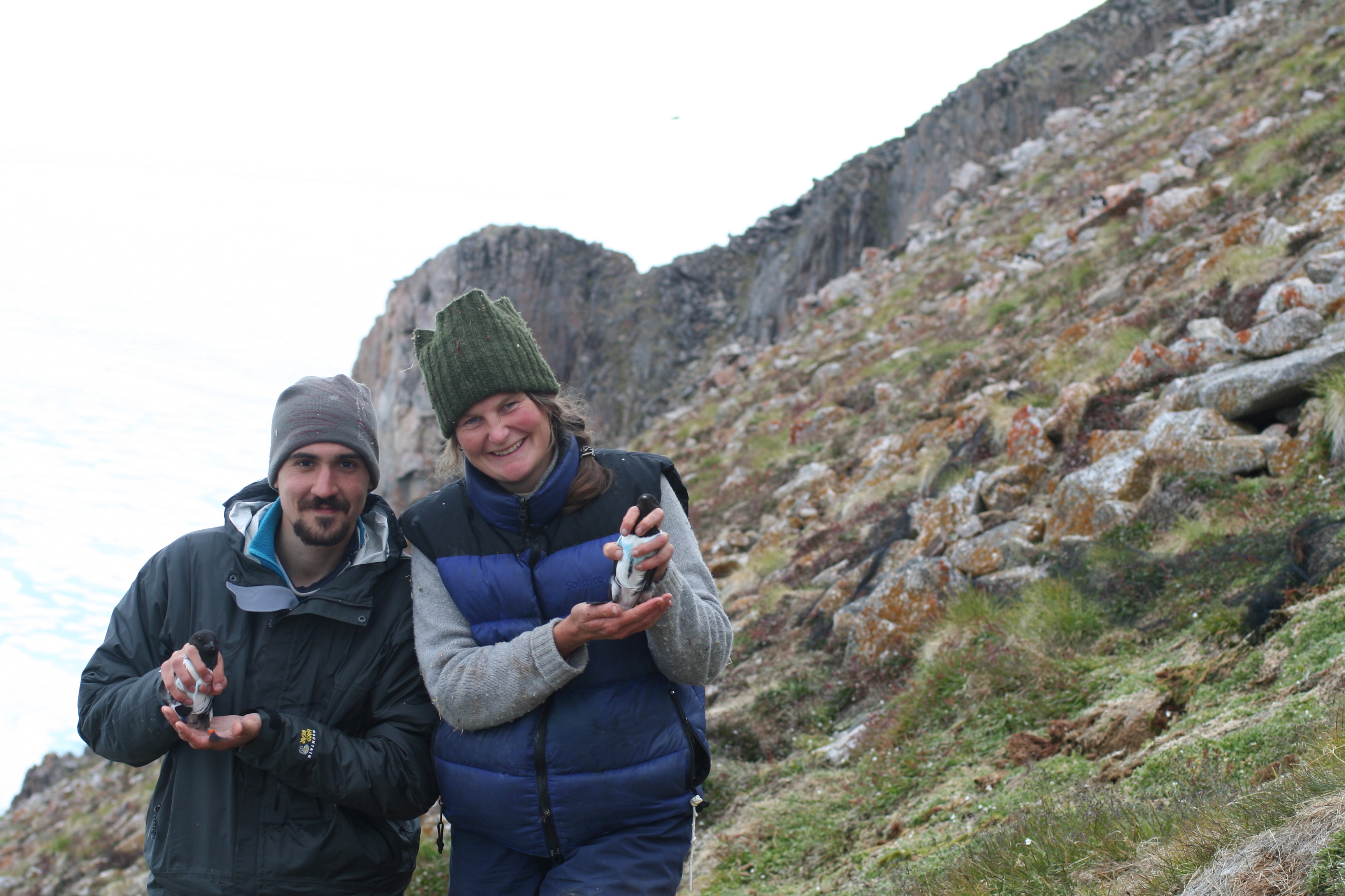 Jerome Fort and Ann Harding hold newly banded adult Little Auks. Kap Hoegh, Greenland.