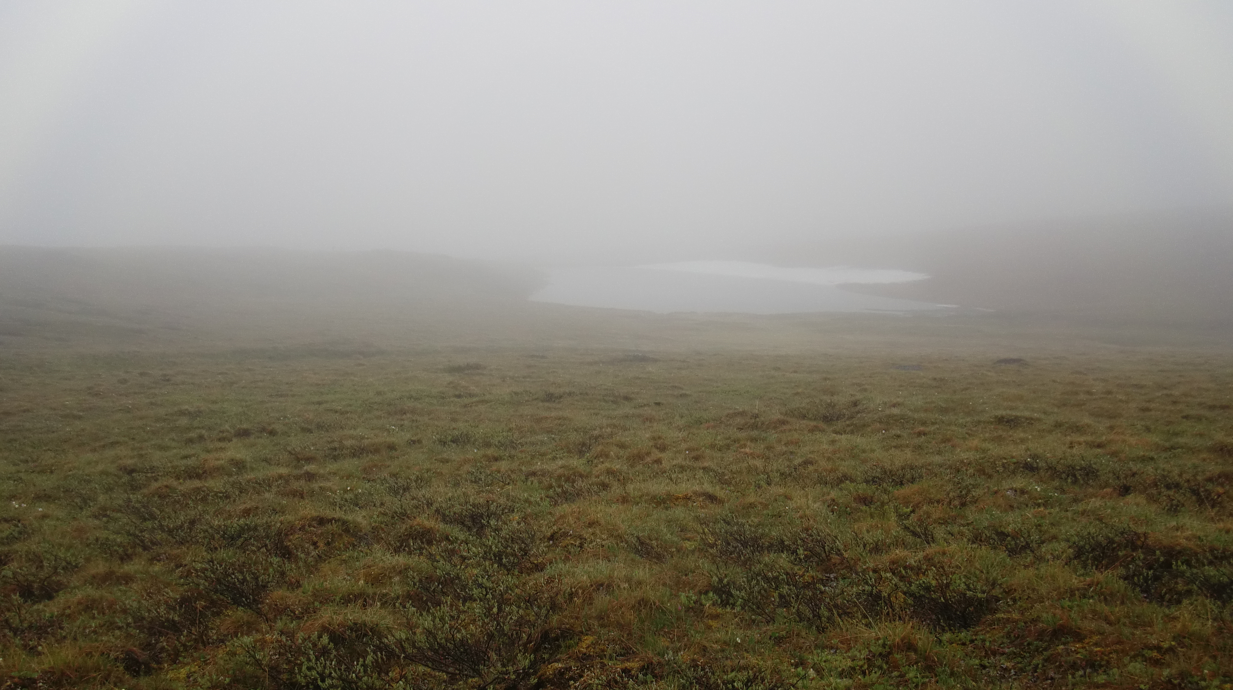 One of the Fog Lakes peers out of the fog. Toolik Field Station, Alaska.