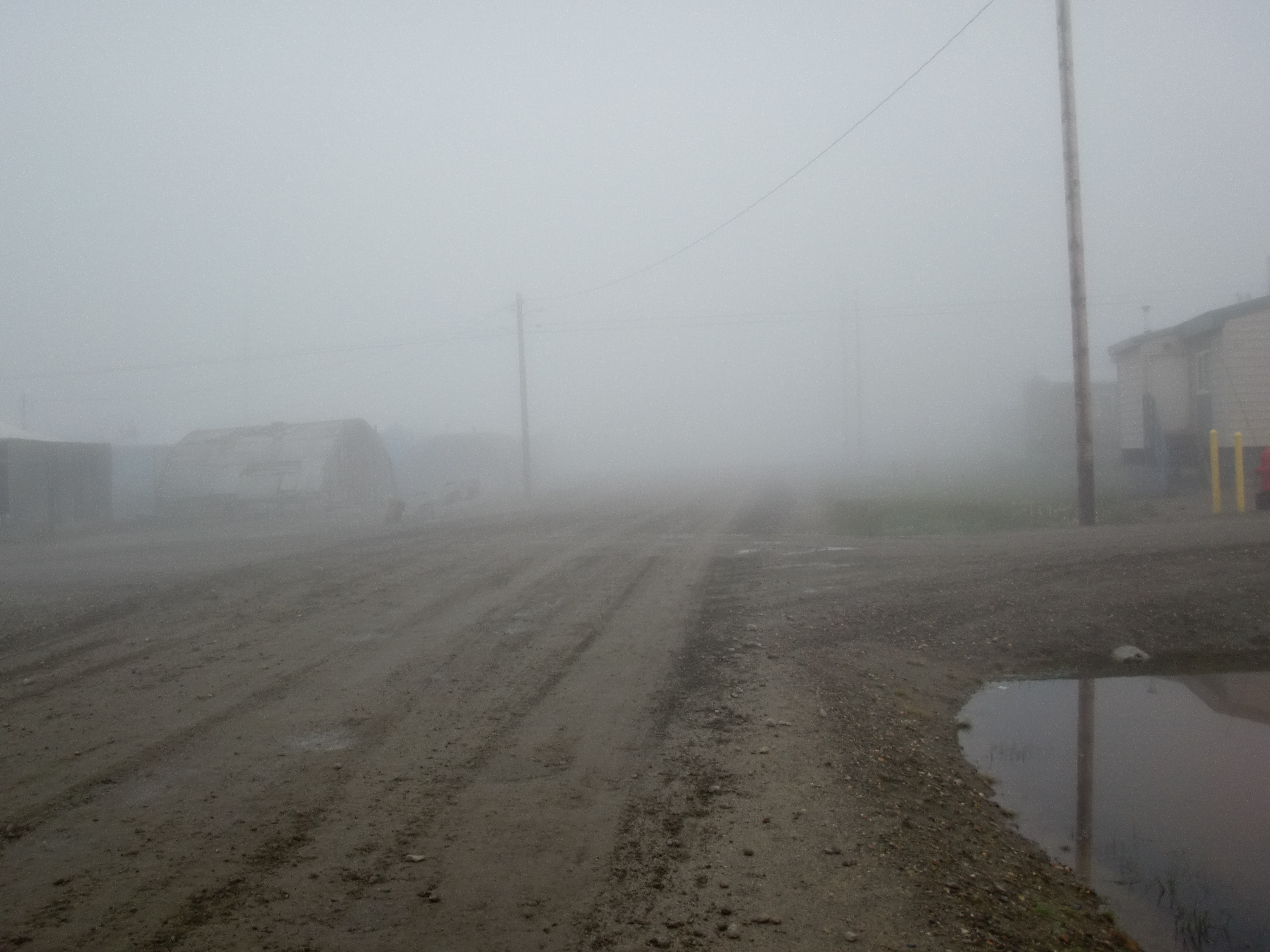 Looking toward the bunkhouse in thick fog. Kaktovik, Alaska.