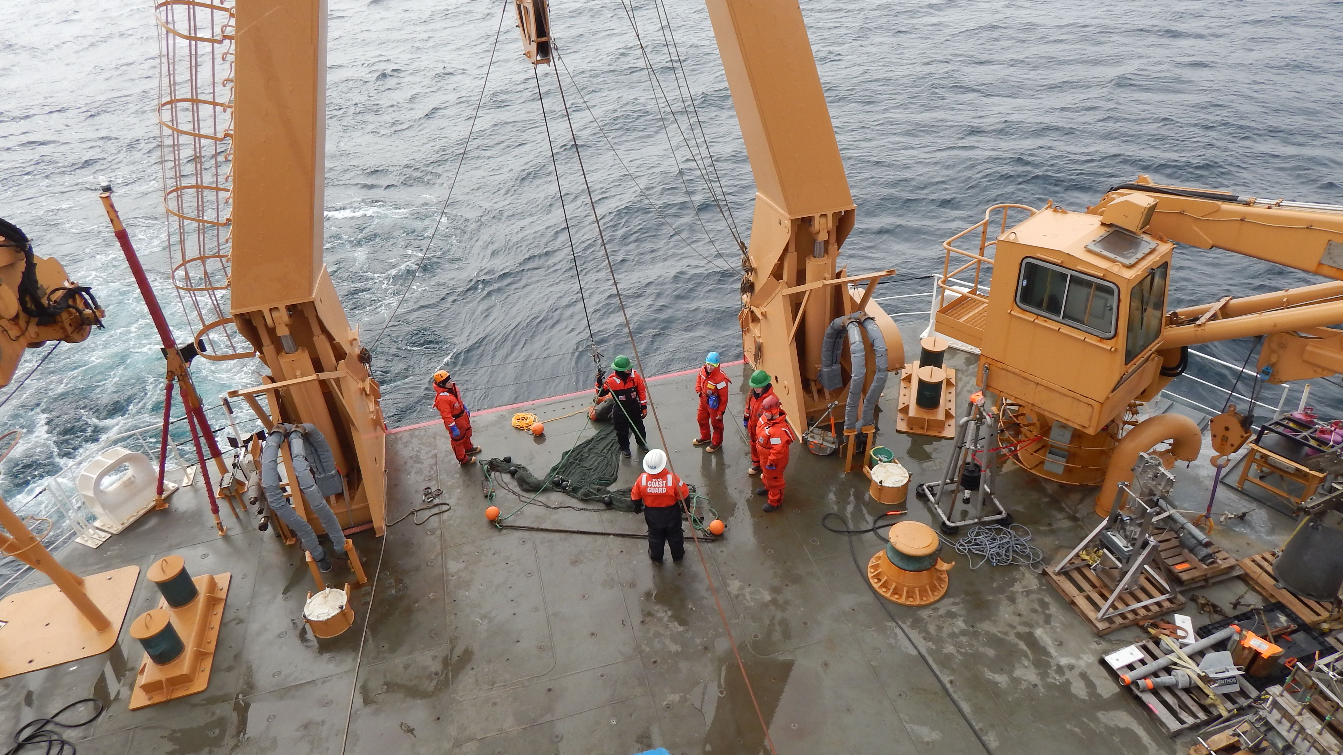 This trawl net is readied on the plumb staff beam. Aboard the USCGC Healy icebreaker on the Chukchi Sea.