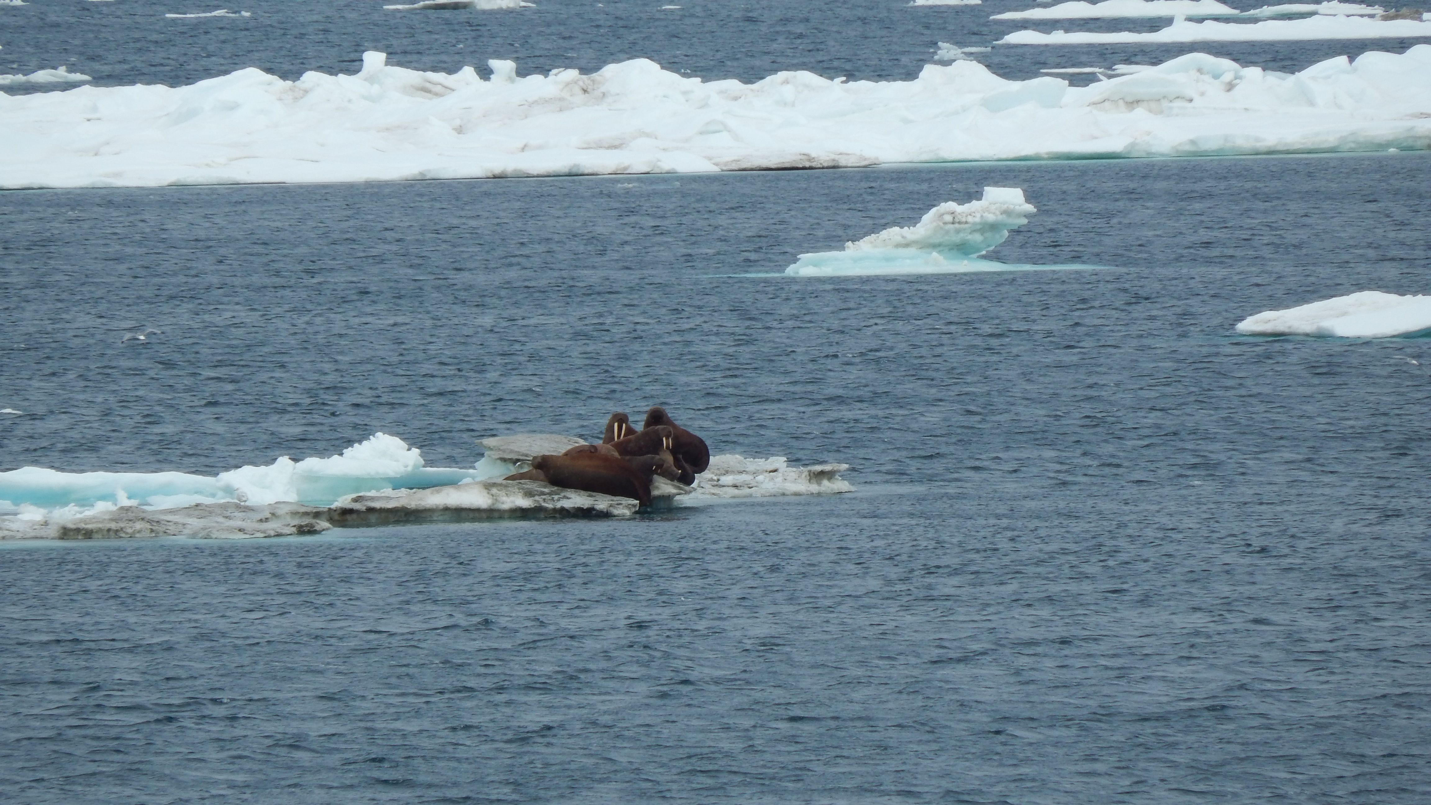A small group of walruses rest on the sea ice. Aboard the USCGC Healy icebreaker on the Chukchi Sea.