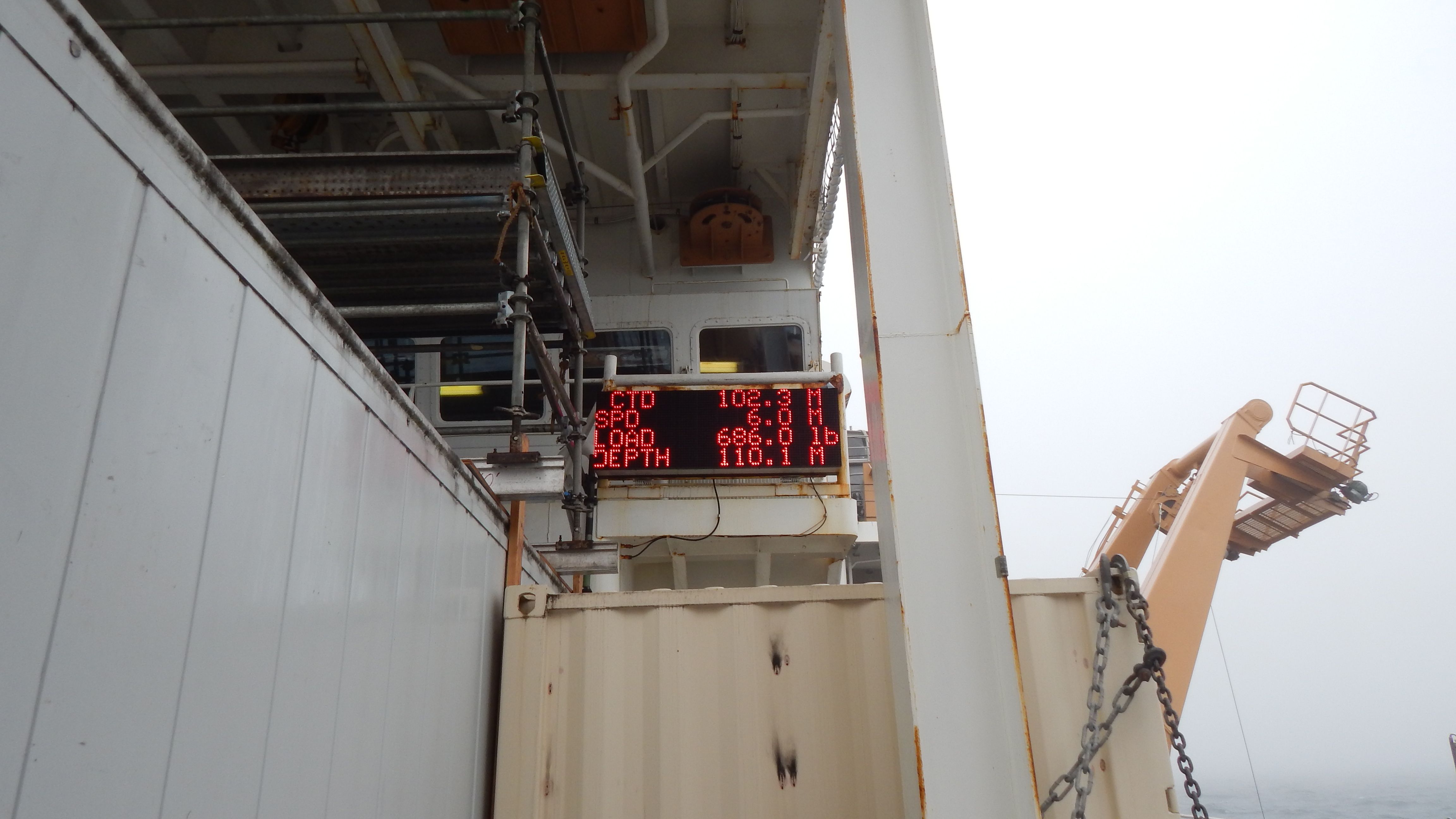 The scoreboard says that the CTD (conductivity, temperature, and depth instrument) weighs 686 lbs. Aboard the USCGC Healy icebreaker on the Chukchi Sea.
