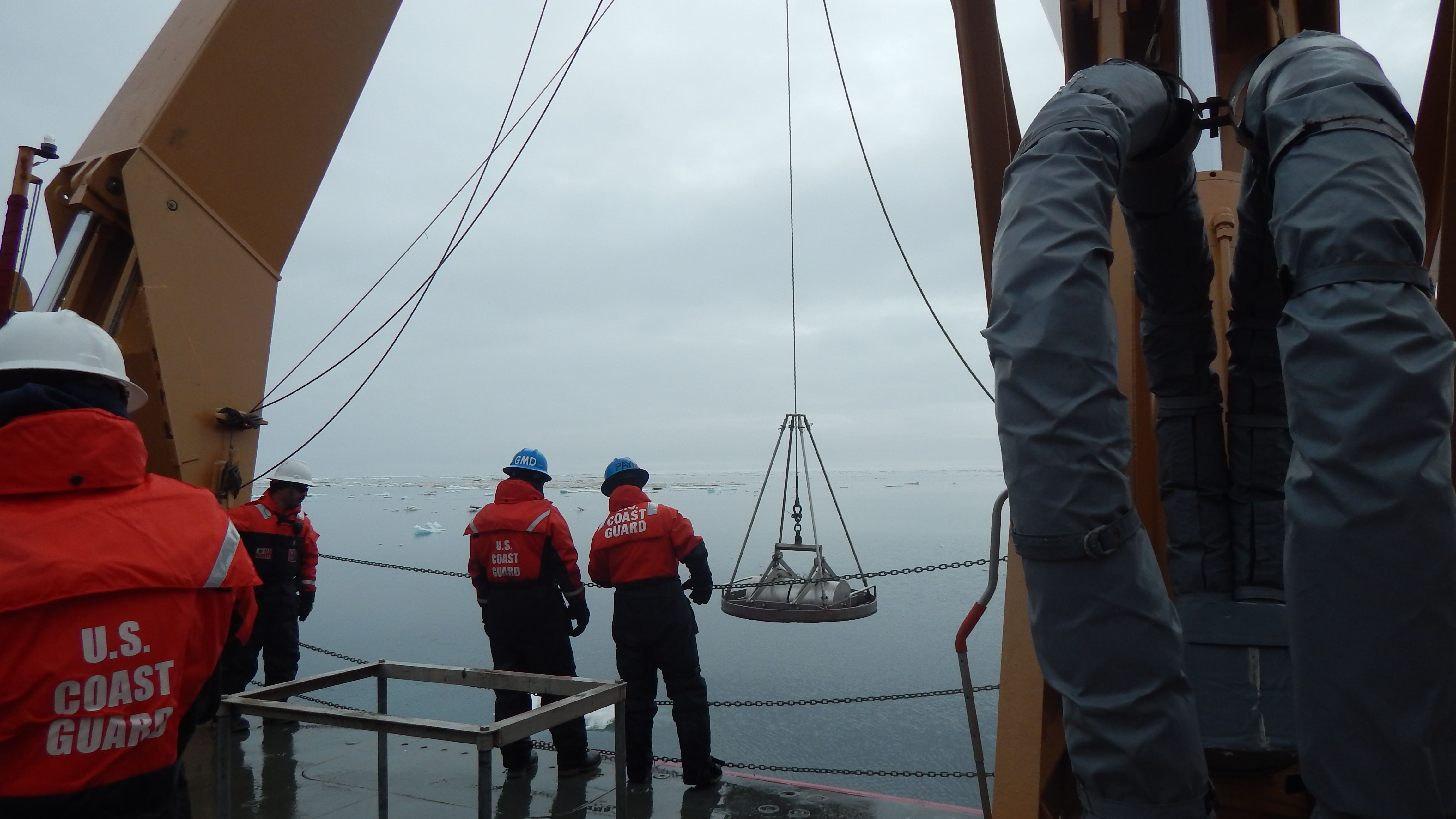 The Double Van Veen Grab is used to colect mud. It can sample for both chemical and biological analysis from the same site. Aboard the USCGC Healy icebreaker on the Chukchi Sea.