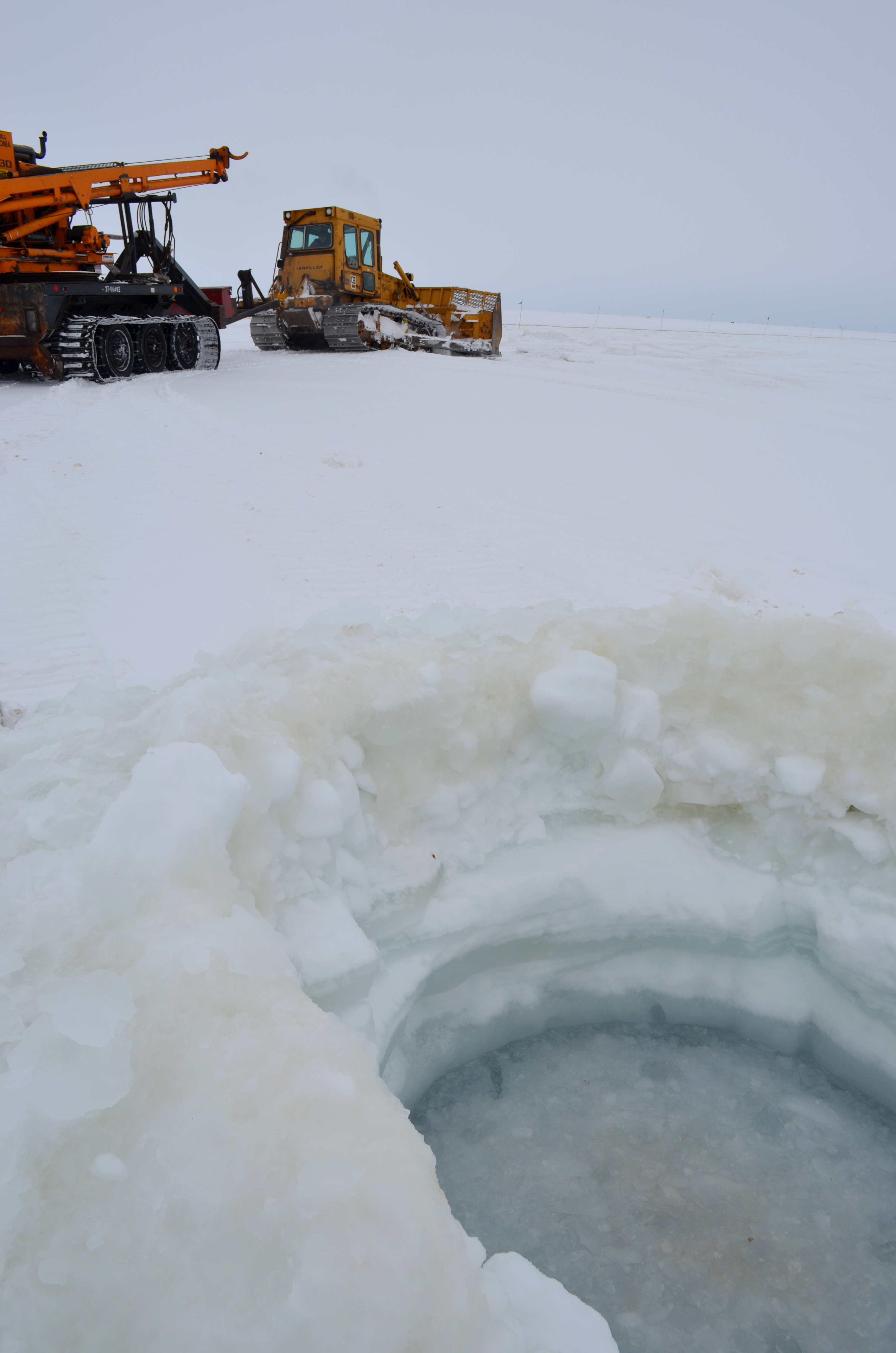 The Caterpillar drives away, leaving the dive holes drilled and ready to dive into. McMurdo Station, Antarctica.