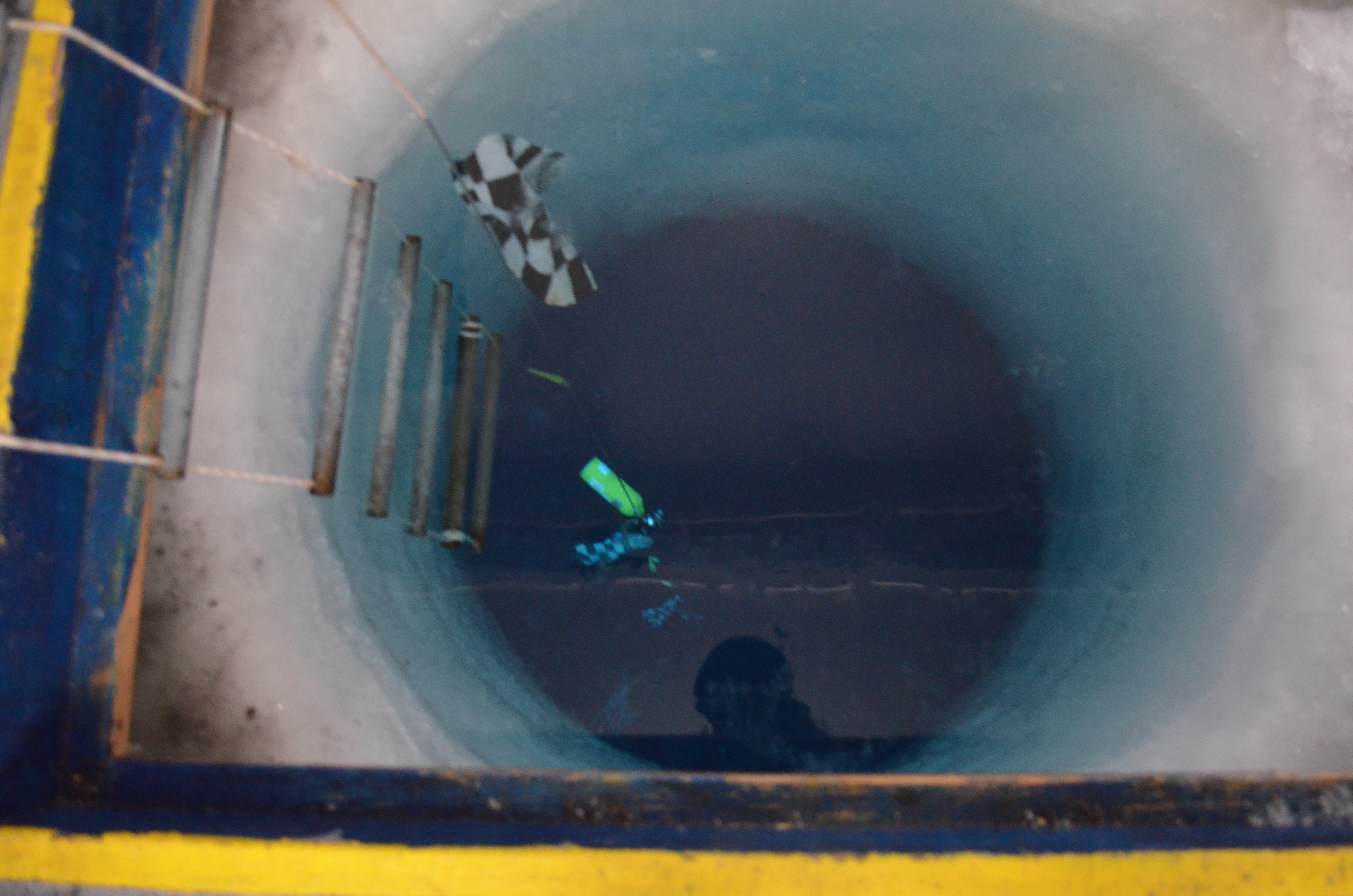 Michael League: "The water is so clear that in this photo you can see the downline with flags attached. The ladder to climb out is on the left." McMurdo Station, Antarctica.